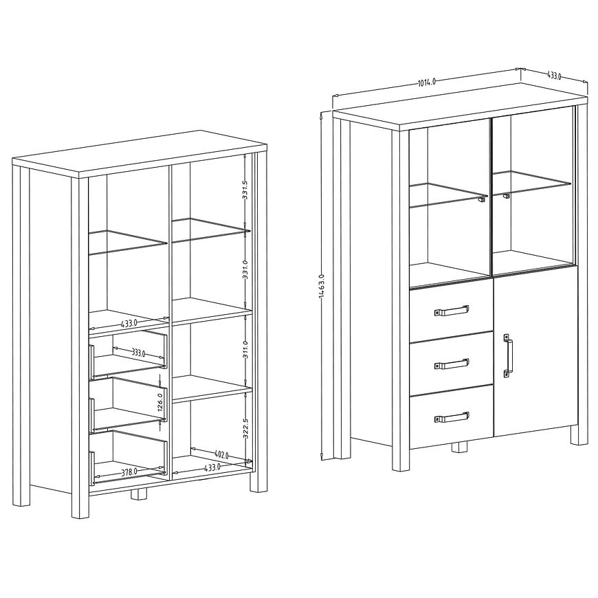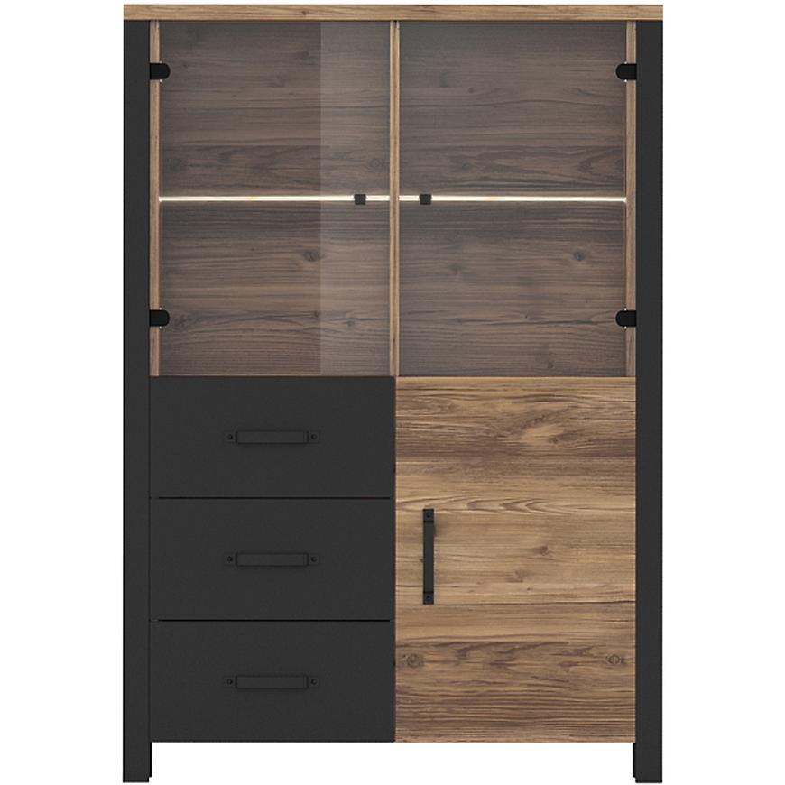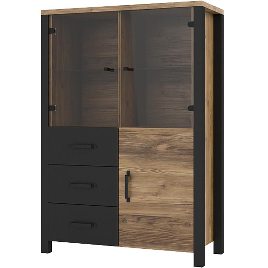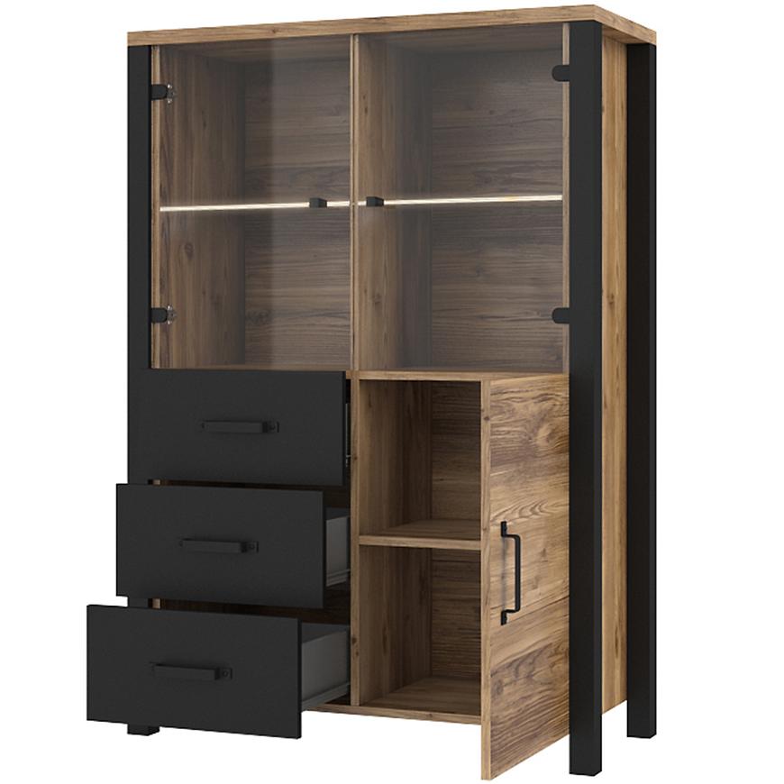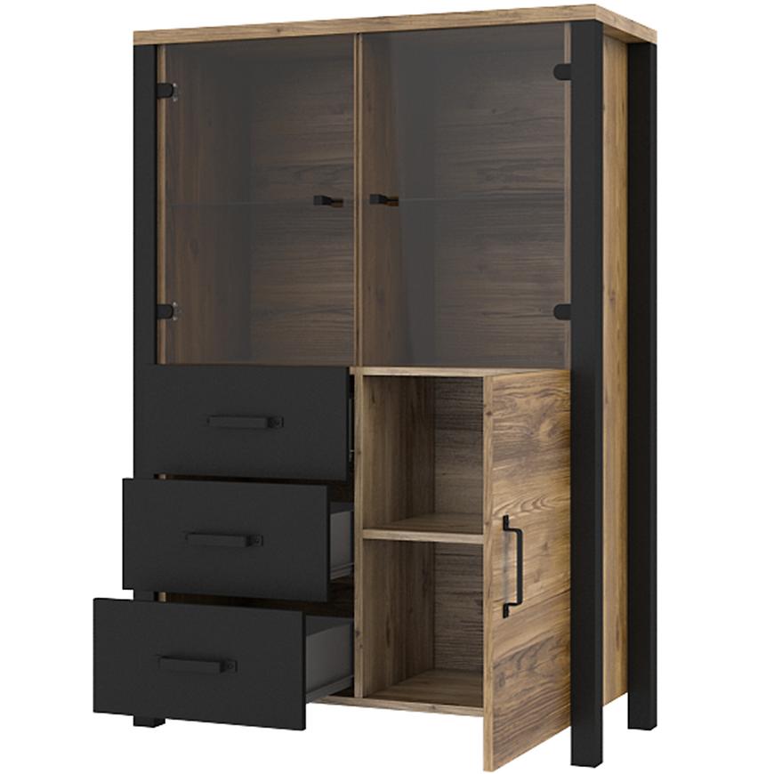 Witryna Olin zachwyca swoim minimalistycznym, loftowym designem. Kolor świerk appenzeller w połączeniu z czarnym supermatem nadaje wnętrzu niepowtarzalnego kontrastu, który przyciąga uwagę i dodaje charakteru. To idealne połączenie, które pasuje do różnych aranżacji wnętrz. Witryna została wykonana z trwałej płyty wiórowej laminowanej o matowym wykończeniu, co zapewnia jej solidność i długotrwałość. Konstrukcja jest stabilna, a wykończenie matowe nadaje jej elegancji.