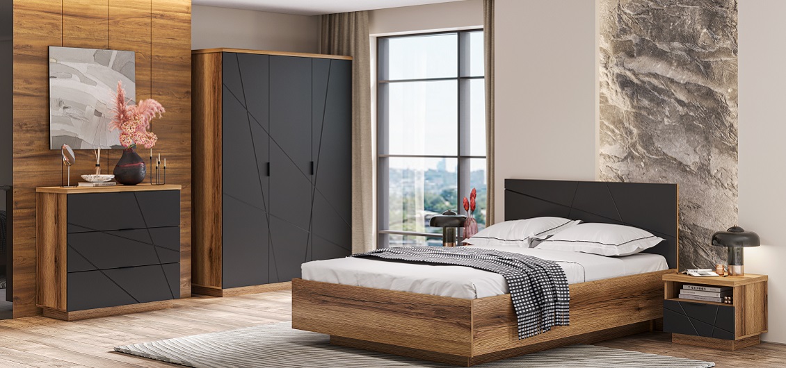 Kolekcja mebli do pokoju dziennego Orient to odsłona nowoczesnej elegancji i funkcjonalności, połączona w perfekcyjny sposób. Dekor w ciemnym odcieniach dąb delano z elementami w kolorze czarny mat tworzy kontrastową i urzekającą paletę kolorów. Zestaw nadaje pomieszczeniu głębi i elegancji, jednocześnie harmonizując z nowoczesnym stylem. Fronty oraz korpusy mebli prezentują delikatne matowe wykończenie, które dodaje kolekcji subtelności i równowagi wizualnej.