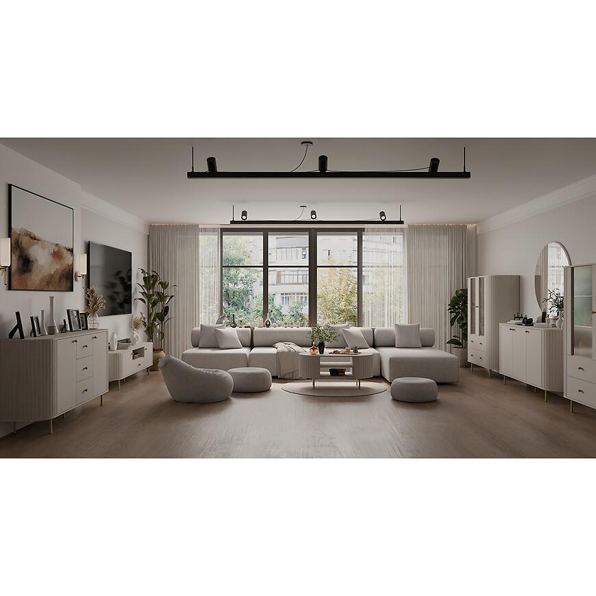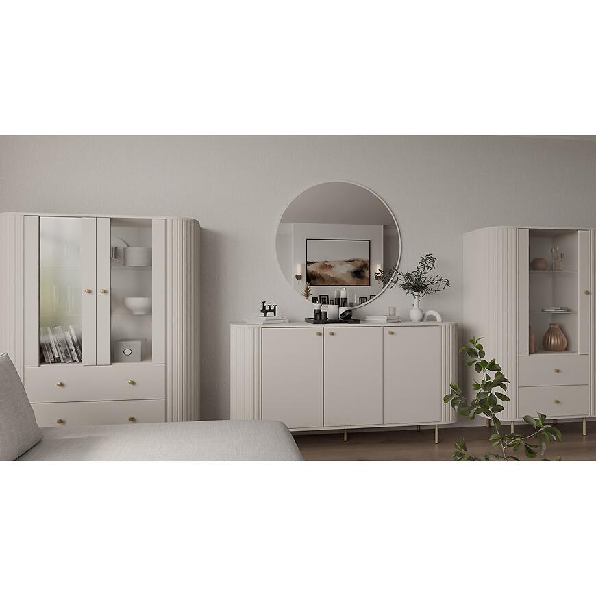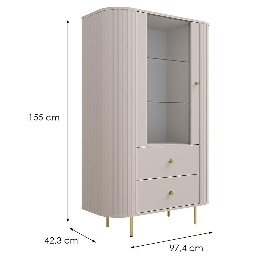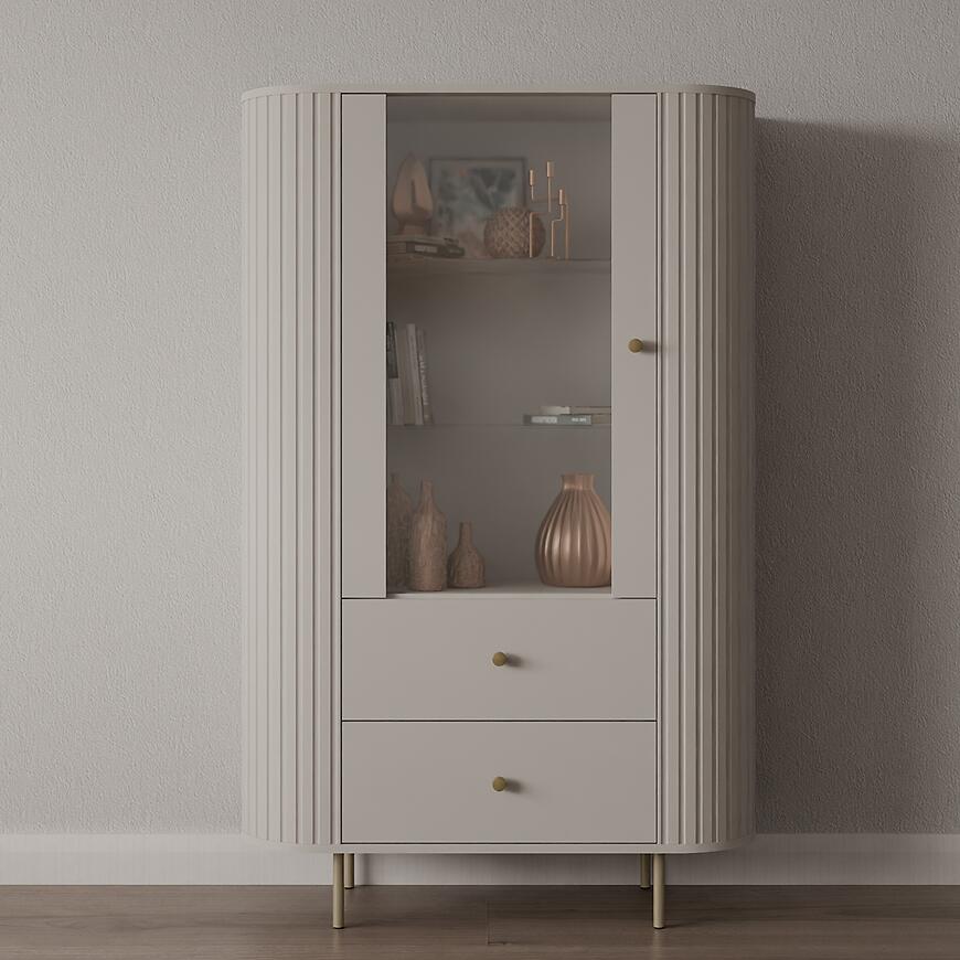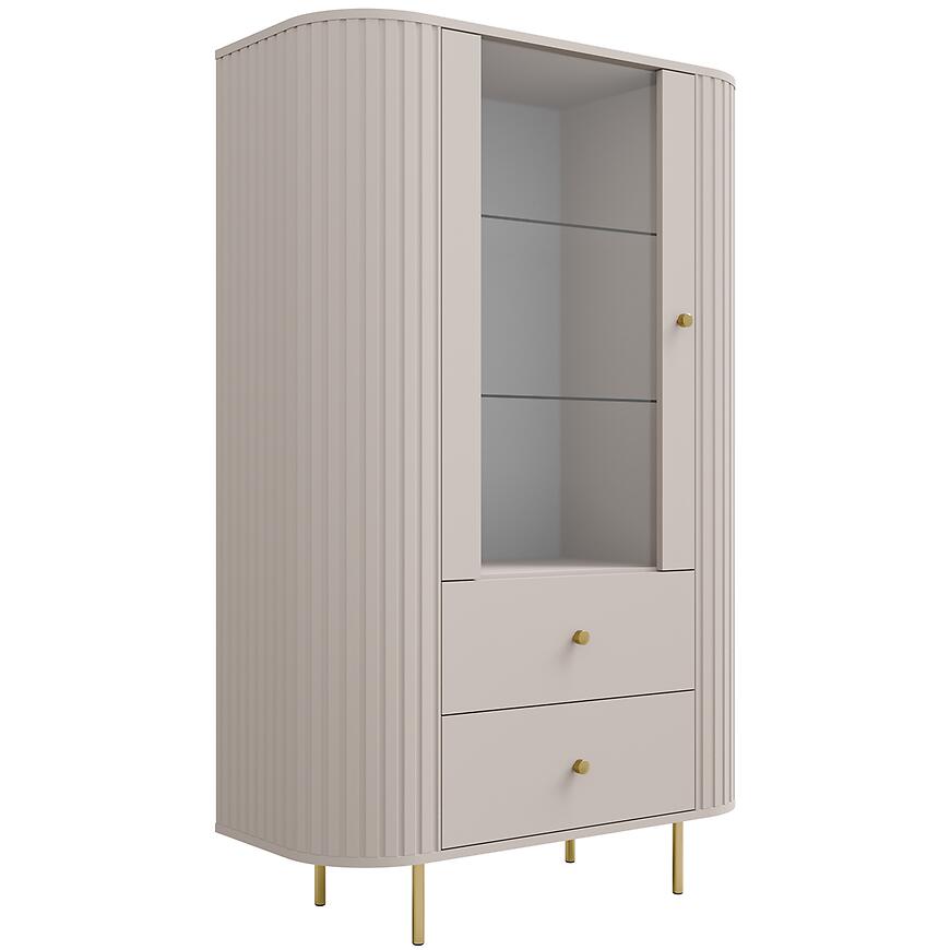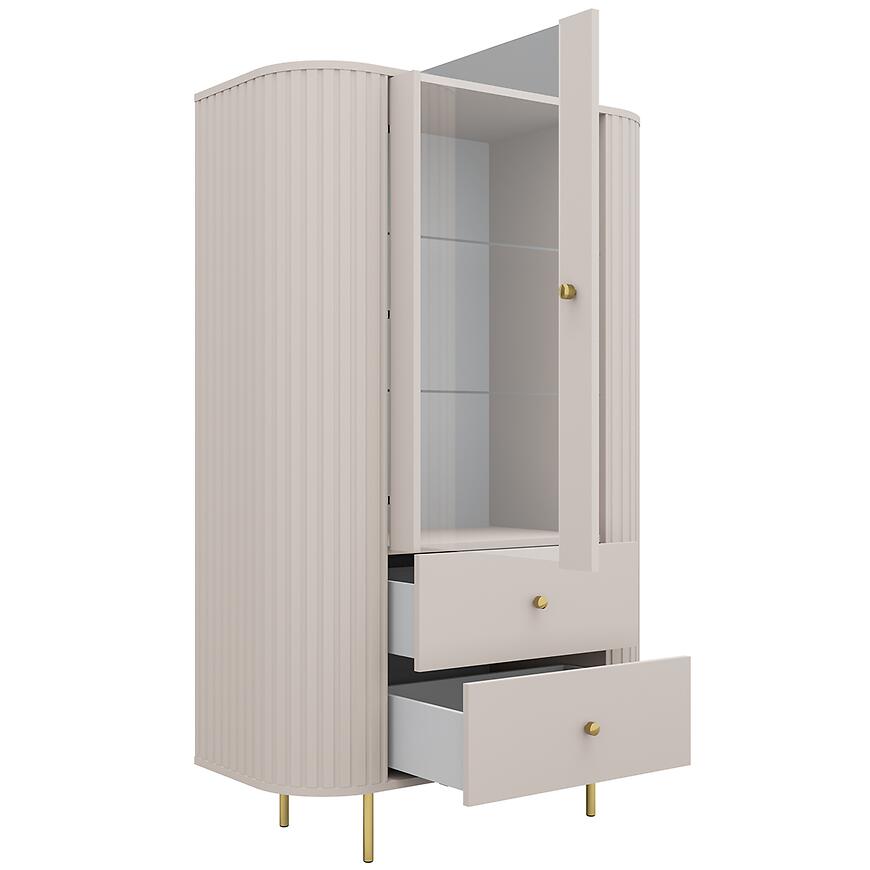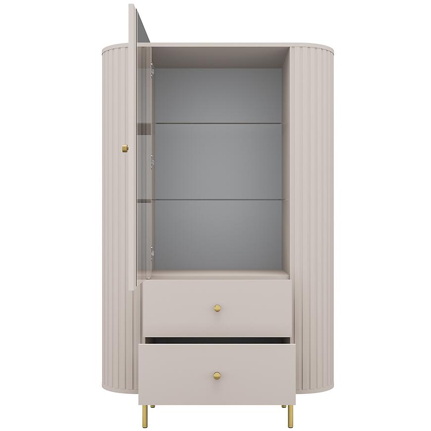 Kolor beż piaskowy (kaszmir) wprowadza do wnętrza subtelne ciepło i naturalną harmonię, co pozwala na łatwe dopasowanie witryny do różnych stylów wnętrz. Neutralny odcień sprawia, że mebel doskonale komponuje się zarówno z jasnymi, jak i ciemniejszymi aranżacjami, a jego nowoczesna forma wprowadza równowagę i lekkość do przestrzeni.