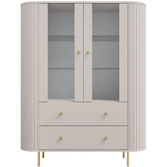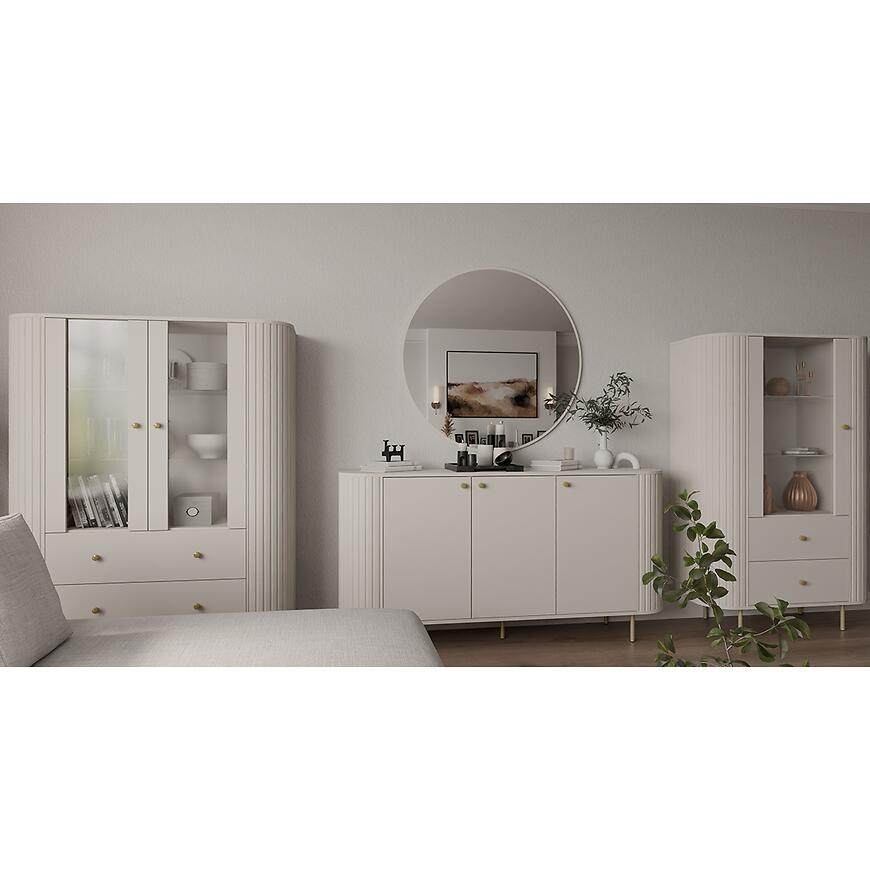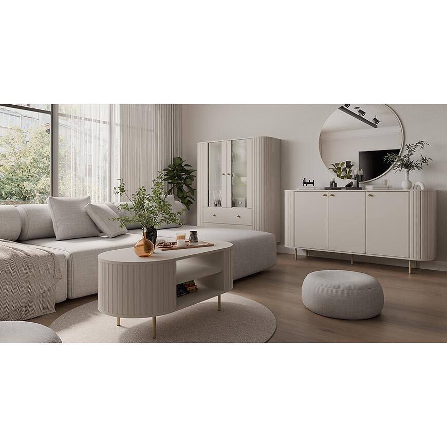 Witryna Ovalio 122 2F 2S beż piaskowy (kaszmir) może pełnić rolę centralnego mebla w salonie, jadalni lub pokoju dziennym, eksponując dekoracje i zapewniając funkcjonalną przestrzeń do przechowywania.