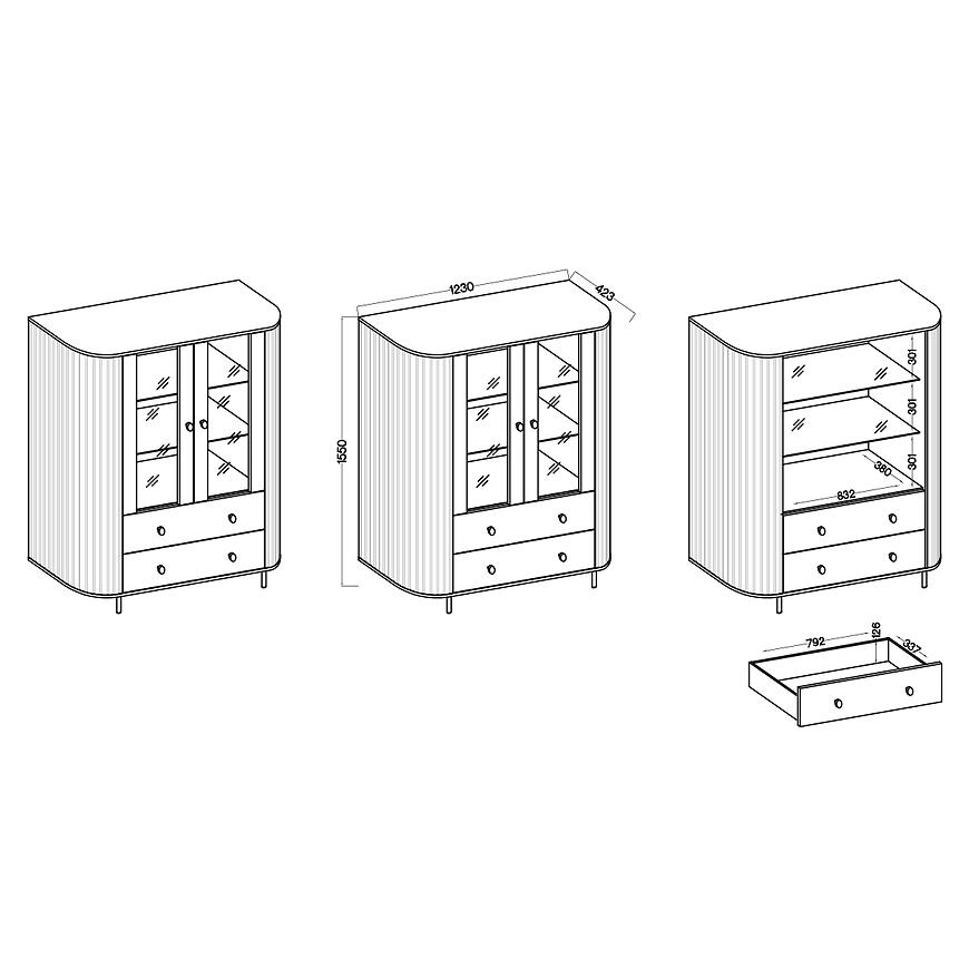 Witryna została wyposażona w dwoje drzwi, dwie półki oraz dwie szuflady, co daje szerokie możliwości organizacji wnętrza. Półki pozwalają ustawić książki, dekoracje lub naczynia, natomiast szuflady sprawdzają się do przechowywania drobnych akcesoriów, dokumentów czy dodatków domowych.