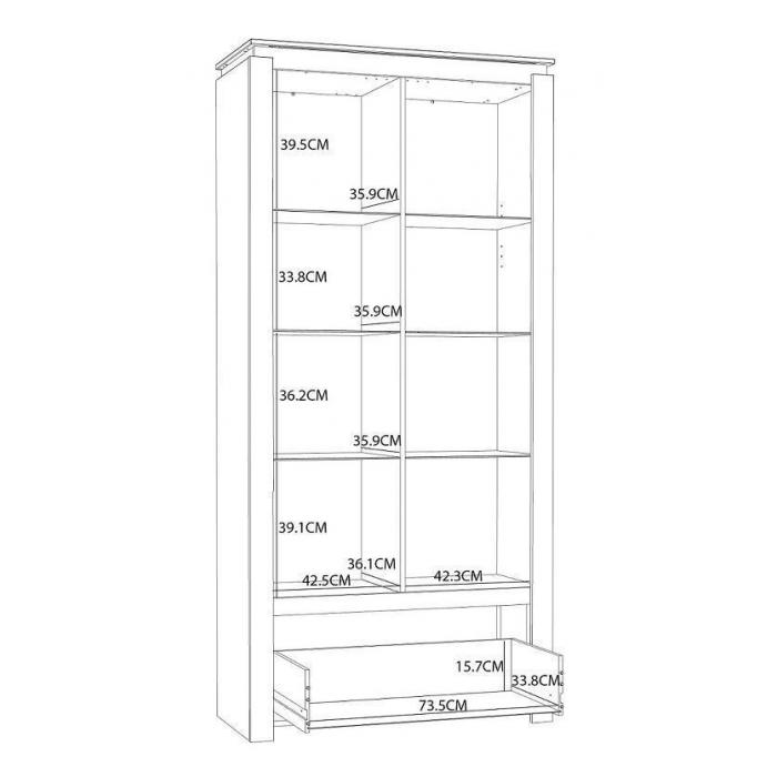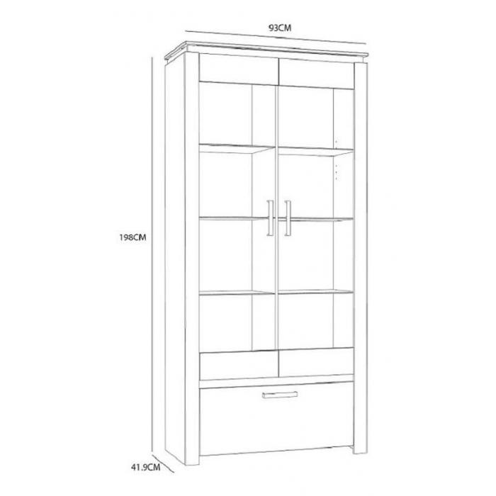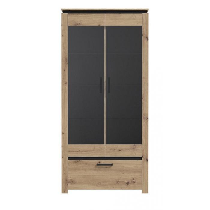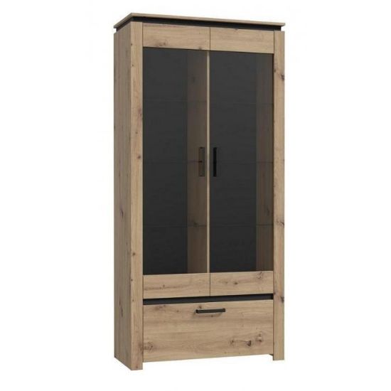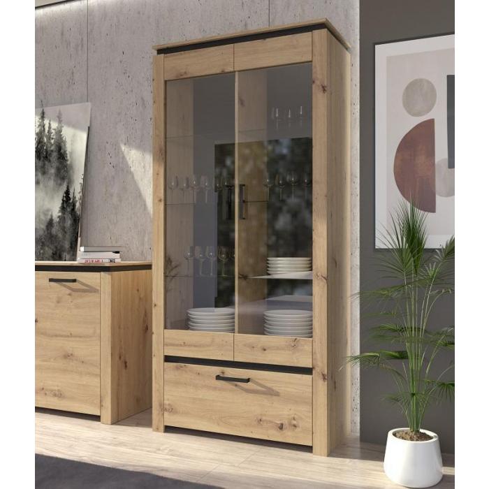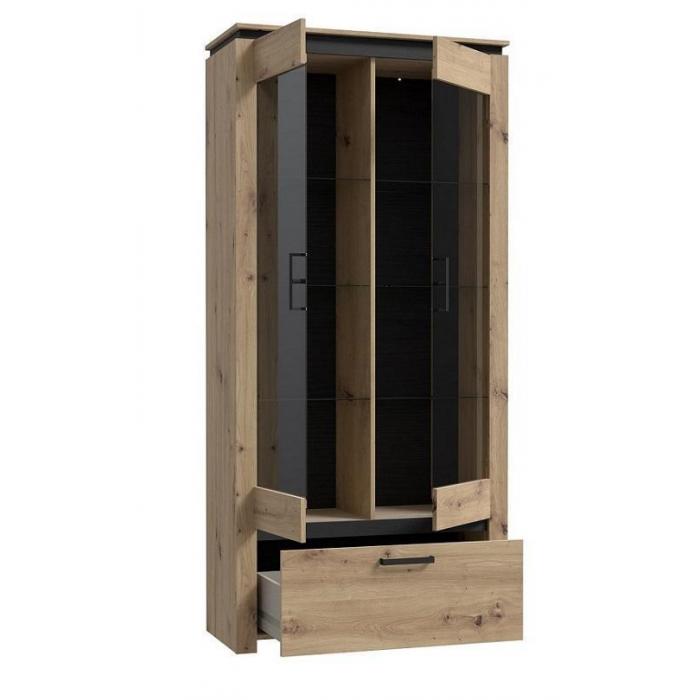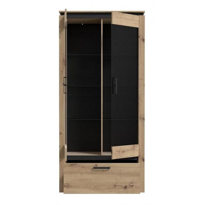 Wykonana w wybarwieniu dąb artisan z czarnymi wstawkami we frontach. Uchwyty metalowe, czarne. W ofercie dostępne są również pozostałe bryły systemy Prado Verde: szafka RTV pod telewizor, komoda 1D2S, komoda 2D3S, szafa, półka wisząca, stolik oraz stół rozkładany.