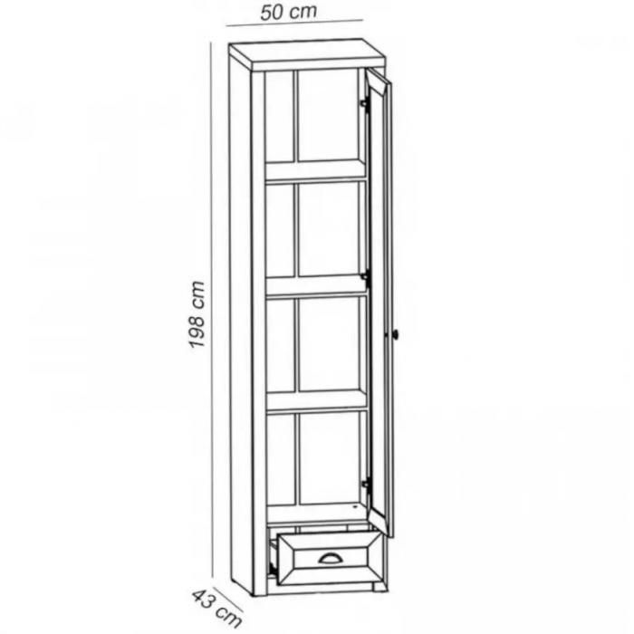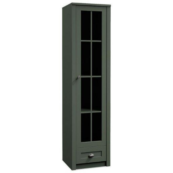 Witryna Prowansja W1S, wysoka z jedną szufladą. Całość wykonana z płyty meblowej laminowanej. Dostępna w kolorze Sosna Green. Uchwyt metalowy w kolorze starego złota. Produkt w paczkach do samodzielnego montażu.