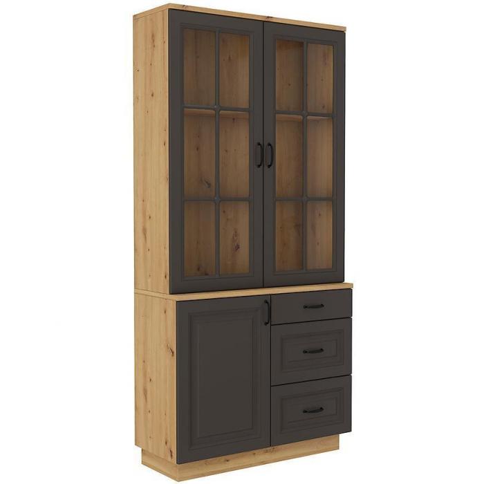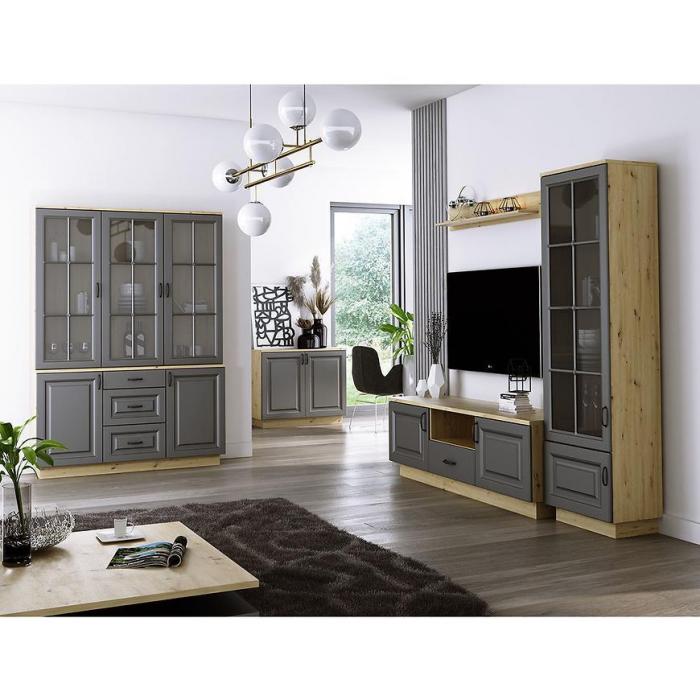 Kolekcja Flawia to przede wszystkim nowoczesność i funkcjonalność w jednym. Kolekcja doskonale sprawdzi się w każdym salonie. Wygląd mebli jest rustykalny, a zarazem bedzie pasował do większości wnętrz. Front mebla został wykonany z płyty MDF, natomiast korpus to płyta wiórowa laminowana. Witryna posiada dwie półki, drzwi są dwudrzwiowe i przeszklone.