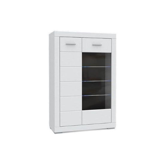 Witryna Snow SNWV521 to mebel o wysokości 154 cm, z podwójnymi drzwiami. Jedne z nich są częściowo przeszklone, dlatego widać przez nie czarne wnętrze oraz trzy półki. Mogą one zostać podświetlone przy pomocy lampek LED, dzięki czemu eksponują przedmioty, które się na nich znajdują. Materiał, z którego wykonano szafkę, to biała, matowa płyta laminowana o grubości 15 mm. Witryna Snow SNWV521 będzie stonowanym dodatkiem pasującym do przestronnych wnętrz, w których dominują wielobarwne dodatki. Jest bardzo funkcjonalna, ponieważ na górnym blacie można postawić różnego rodzaju przedmioty i dekoracje. Dzięki prostej bryle i chromowanym uchwytom pasuje nie tylko do modernistycznych, ale również do romantycznych pomieszczeń, nadając im ciekawego charakteru.