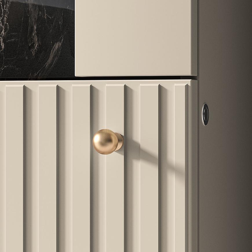 Kolorystyka i wykończenie: Witryna Sophie 02 utrzymana jest w jednolitym, eleganckim kolorze cashmere, zarówno na frontach, jak i na korpusie. Matowe wykończenie dodaje jej subtelnego, nowoczesnego charakteru, który doskonale komponuje się z różnymi aranżacjami wnętrz.