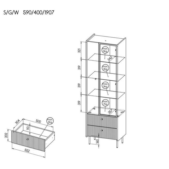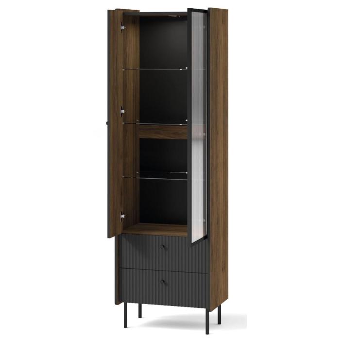 Witryna posiada opcję montażu drzwi szklanych po prawej lub lewej stronie. Ramka aluminiowa anoda w kolorze czarny mat. Szkło w drzwiach bezbarwne, ornamentowe, hartowane. Nogi metalowe malowane proszkowo. Tivoli to nowoczesny system pokojowy w kolorystyce orzech warmia, san sebastian. Na frontach jako element ozdobny zastosowano ryflowane wstawki MDF w kolorze czarnym. Uchwyty wykonane zostały z tworzywa sztucznego. Dostępny w paczkach do samodzielnego montażu.