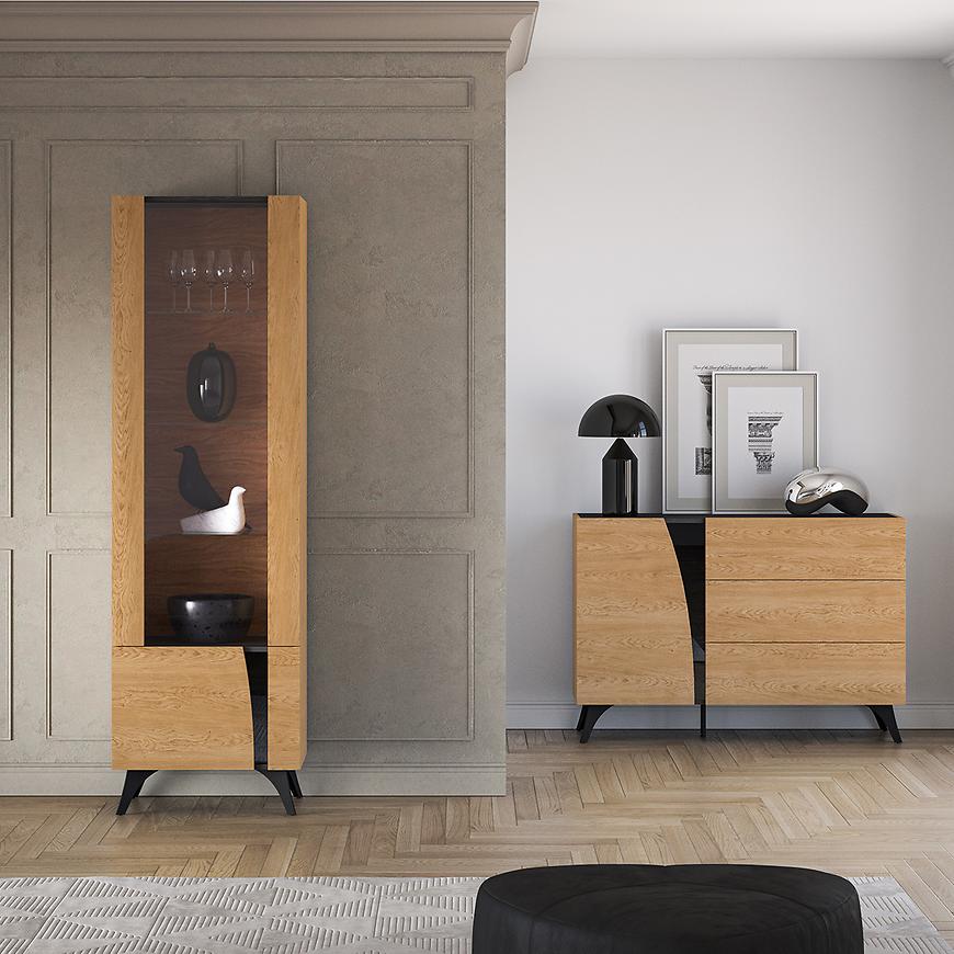 Dodatkowo na frontach zastosowano wstawki z czarnego szkła, które podkreślają wyrazisty styl kolekcji. W witrynach można opcjonalnie zamontować oświetlenie LED (dostępne za dopłatą), dzięki któremu wnętrze zyska niepowtarzalny klimat i przyjemną atmosferę.