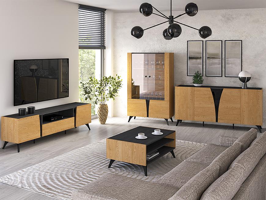 Kolekcja Toscania doskonale wpisuje się w nowoczesny styl wnętrzarski, zachowując jednocześnie ciepły charakter dzięki wybarwieniu inspirowanemu naturalnym drewnem. Jasne fronty w zestawieniu z czarnymi detalami tworzą efektowny kontrast, który dodaje wnętrzu głębi. To meble, które sprawdzą się w nowoczesnych salonach, ale z powodzeniem mogą uzupełnić również aranżacje inspirowane stylem industrialnym czy minimalistycznym.