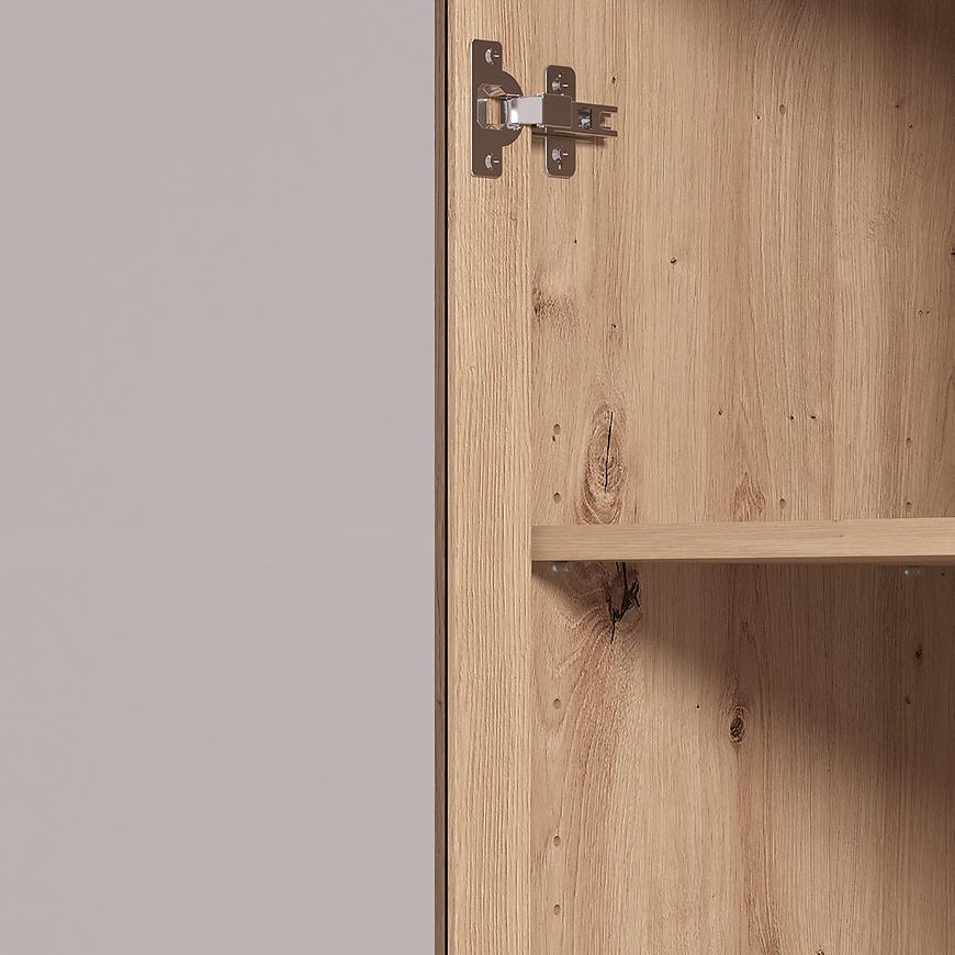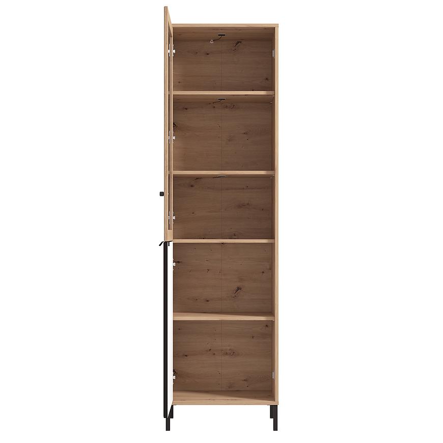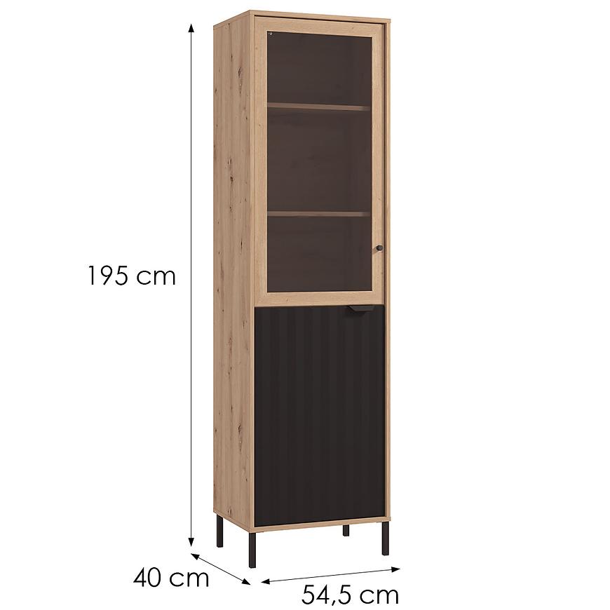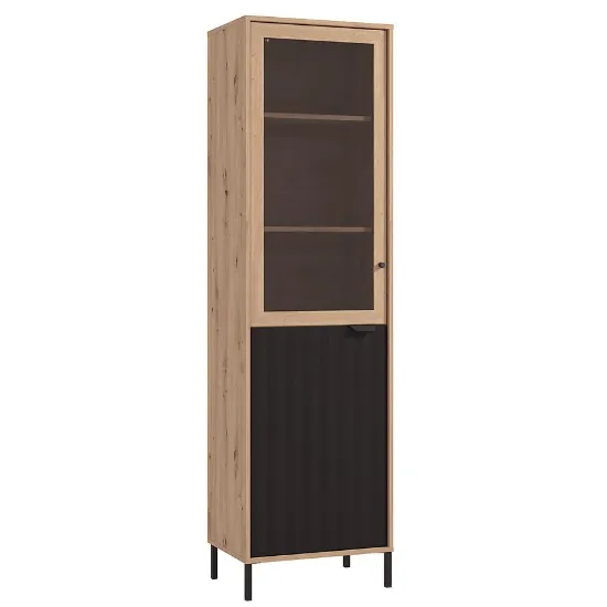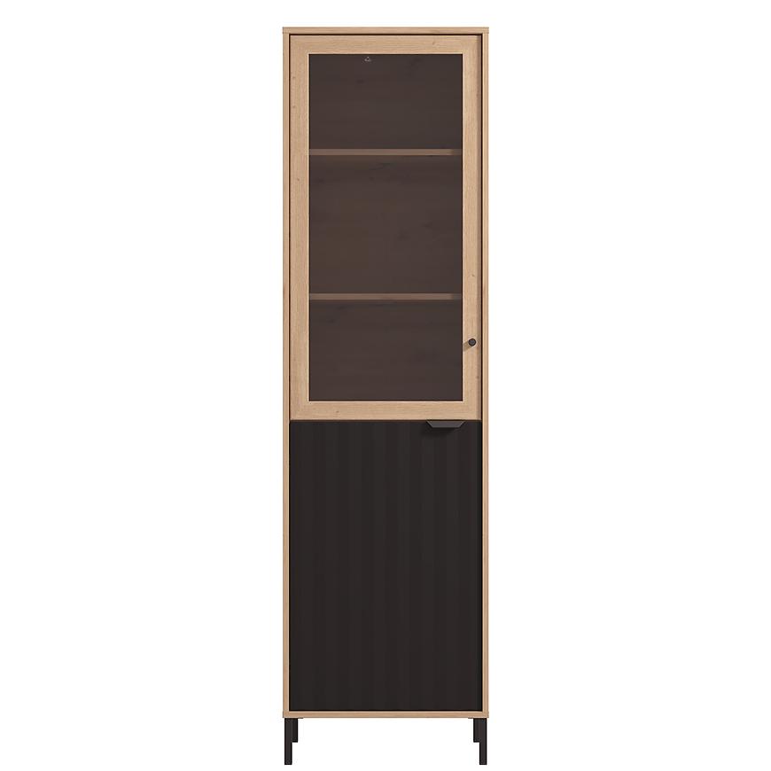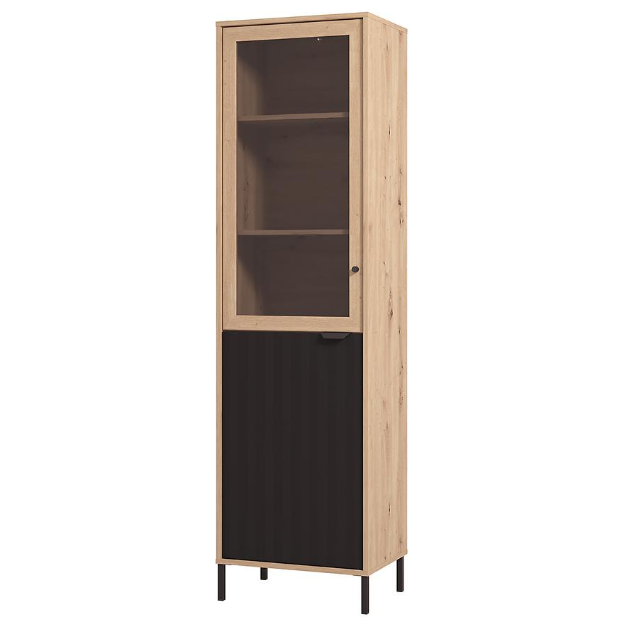 Witryna Vandea 1k Artisan/Czarny 11013560 to nowoczesny i funkcjonalny mebel, wykonany z płyty wiórowej laminowanej w odcieniach jasnego drewna Artisan z czarnymi frontami. Posiada jednodrzwiową konstrukcję i 4 półki, oferując praktyczne miejsce do przechowywania. Matowe wykończenie frontów i korpusu podkreśla elegancki charakter kolekcji VANDEA, a mebel wymaga samodzielnego montażu.