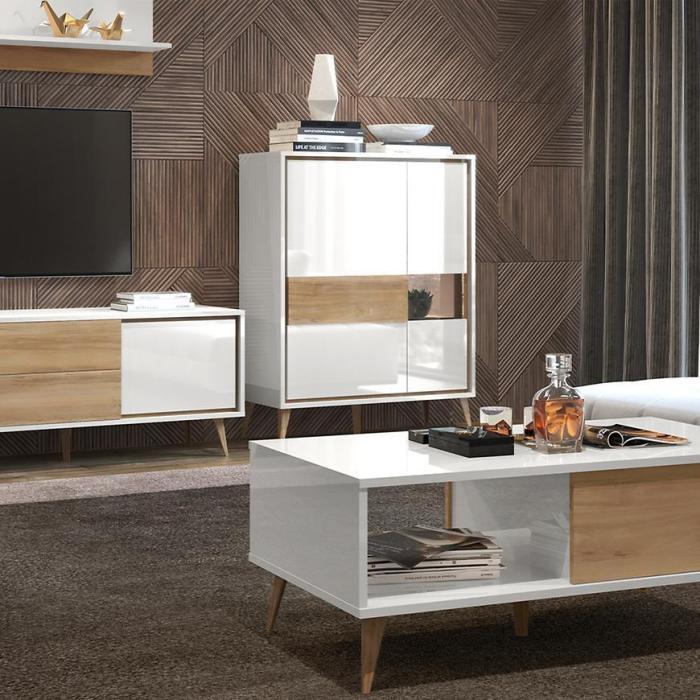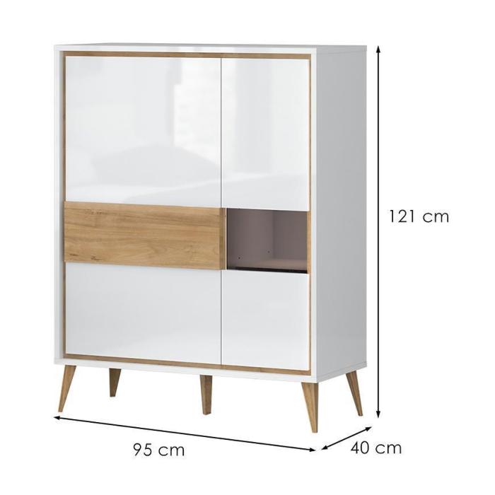Witryna to praktyczny i funkcjonalny mebel. Korpus oraz front wykonany jest z płyty MDF lakierowanej. Mebel będzie doskonałym dodatkiem do każdego wnętrza ze względu na swoją uniwersalną kolorystykę.