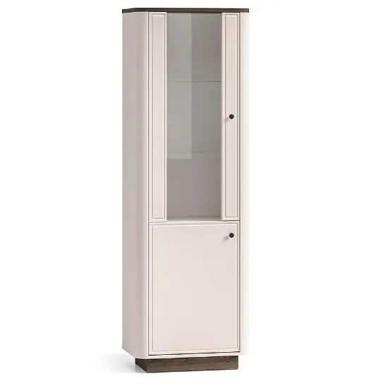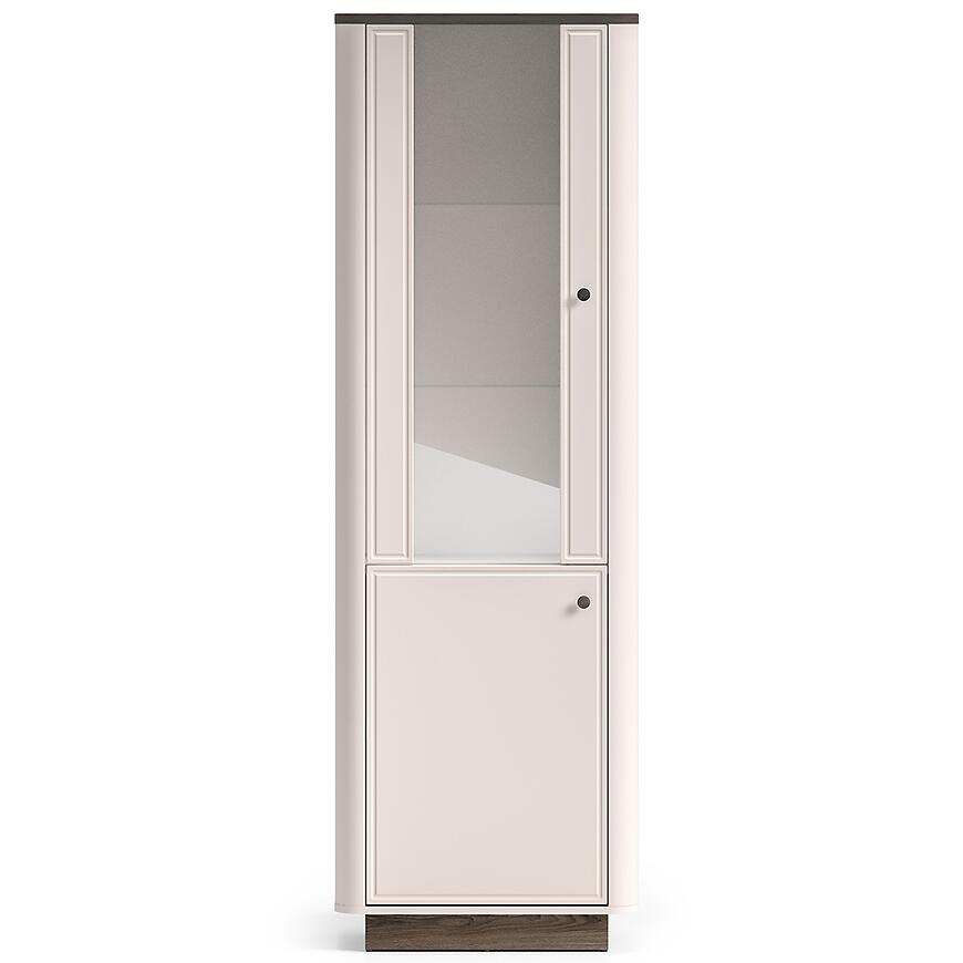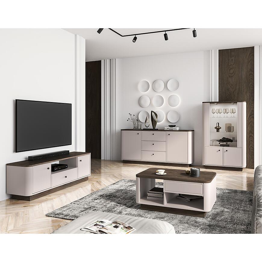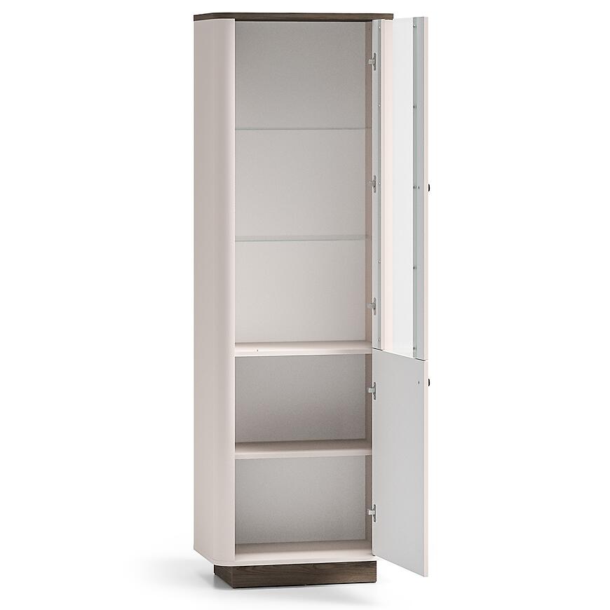 Witryna Vilavio 01 w kolorze dąb/cashmere to stylowy mebel do salonu, który łączy klasyczną formę z nowoczesnym akcentem oświetlenia LED. Subtelna beżowa kolorystyka i matowe wykończenie sprawiają, że witryna doskonale komponuje się z pozostałymi elementami kolekcji Vilavio, tworząc spójną aranżację wnętrza.