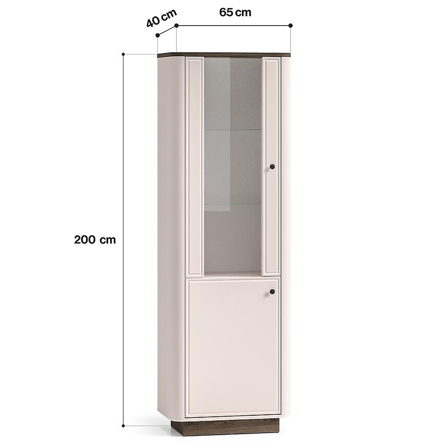 Model o wysokości 200 cm i szerokości 65 cm oferuje pięć pojemnych półek, które umożliwiają wygodne przechowywanie oraz ekspozycję dekoracji, książek czy zastawy. Dwudrzwiowa konstrukcja pozwala na łatwy dostęp do wnętrza, jednocześnie utrzymując estetyczny wygląd całości.