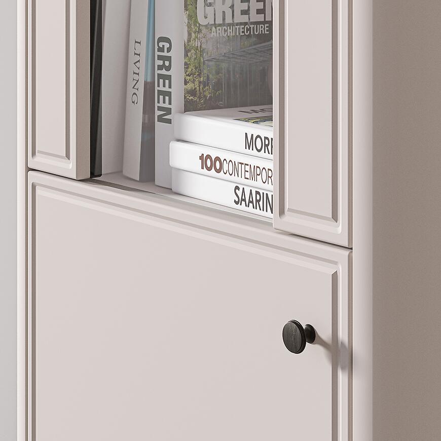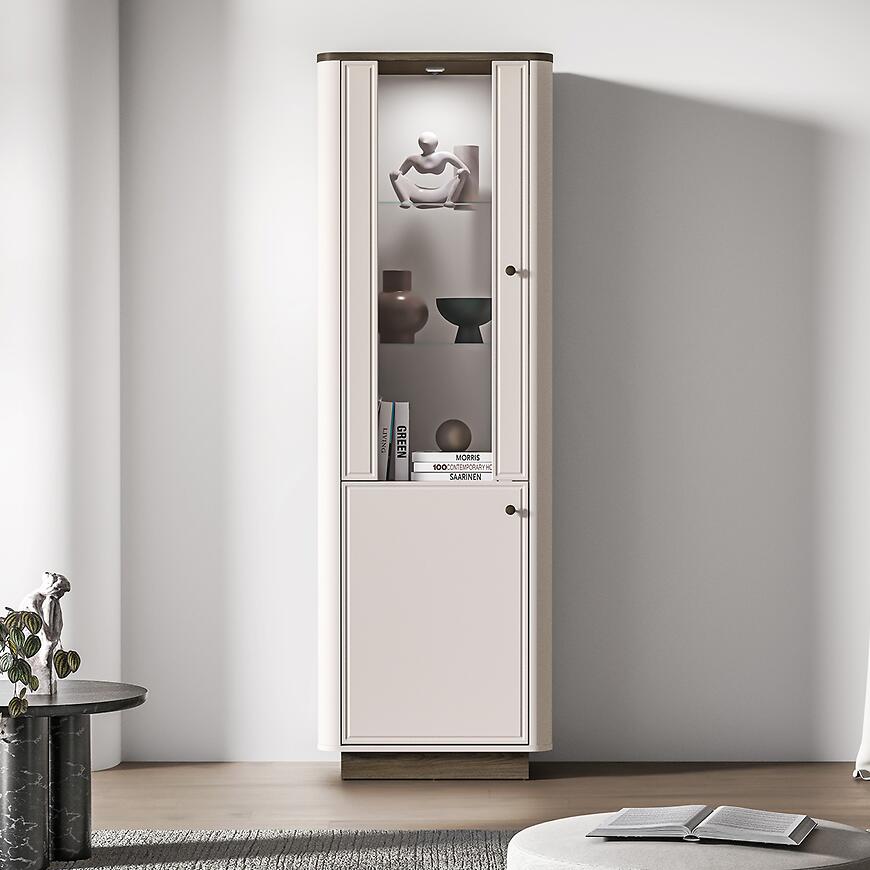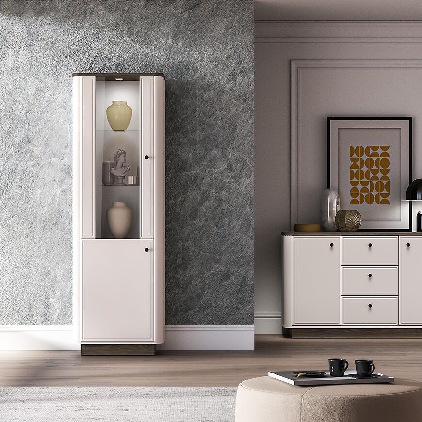 Witryna Vilavio 01 to propozycja dla osób, które chcą połączyć elegancką ekspozycję z funkcjonalnym przechowywaniem, zachowując spójny i estetyczny wygląd salonu.