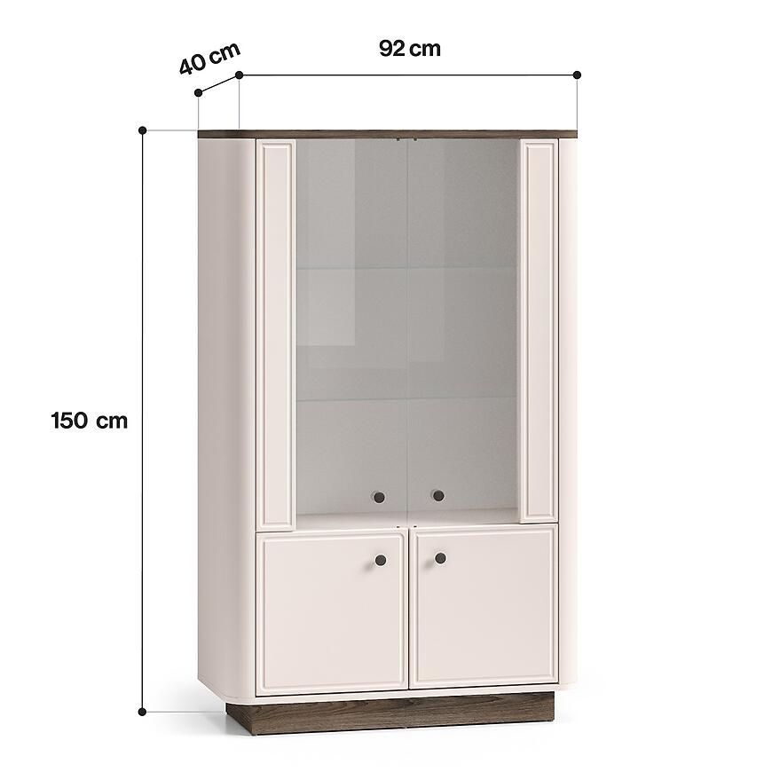 Model o wysokości 150 cm i szerokości 92 cm oferuje cztery praktyczne półki, które pozwalają na wygodne przechowywanie oraz ekspozycję dekoracji, książek czy zastawy. Dwudrzwiowa konstrukcja ułatwia dostęp do wnętrza, jednocześnie zachowując elegancki i uporządkowany wygląd mebla.