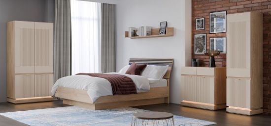 Fronty wykonane z matowej płyty MDF dostępne są w dwóch subtelnych wariantach kolorystycznych – eleganckim antracycie oraz ciepłym kaszmirze. Ich powierzchnię zdobią pionowe frezowania, które nadają meblom nowoczesny, a zarazem nieprzesadzony charakter. Złote uchwyty wprowadzają do wnętrza nutę luksusu i doskonale kontrastują z matowym wykończeniem, tworząc wyrazisty, ale spójny akcent dekoracyjny.