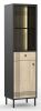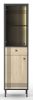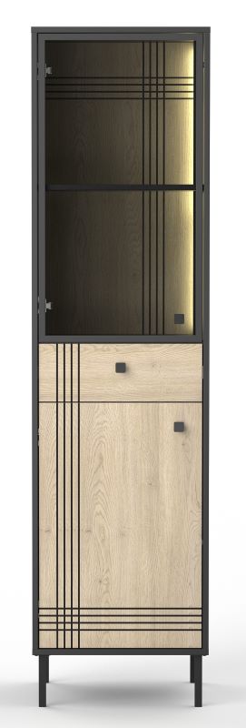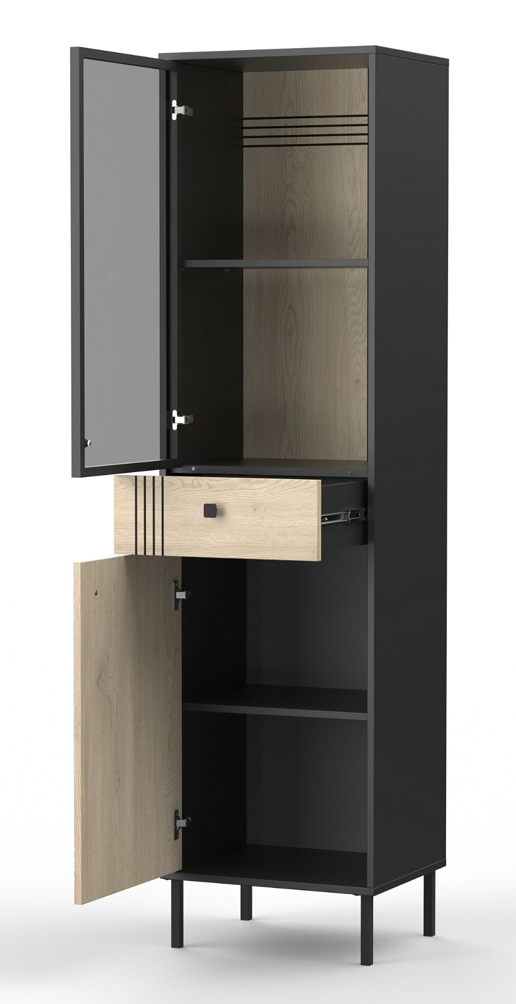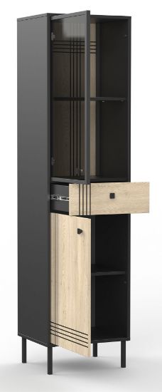 Witryna wąska Quel typ 3 to doskonały wybór dla osób ceniących połączenie klasyki z nowoczesnym designem. Dwudrzwiowa konstrukcja z dwiema półkami i jedną szufladą zapewnia funkcjonalną przestrzeń do przechowywania i eksponowania ulubionych przedmiotów. Jedne z drzwi posiadają szklany front w czarnej aluminiowej ramce, co dodaje meblowi lekkości i podkreśla jego elegancki charakter.