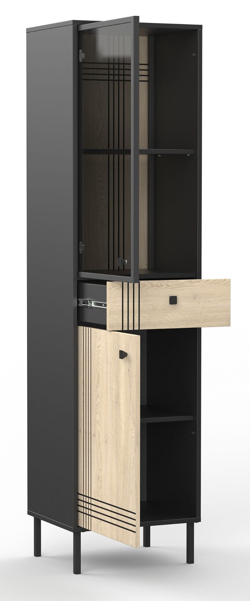 Korpus w głębokiej czerni doskonale komponuje się z dekorem cremona, który swoim ciepłym, drewnianym odcieniem nadaje wnętrzu przytulności. Subtelne frezy dodają finezji i podkreślają wyjątkowy design witryny. Całość osadzona jest na czarnych stalowych nóżkach, które nie tylko nadają lekkości, ale również ułatwiają utrzymanie czystości pod meblem.
