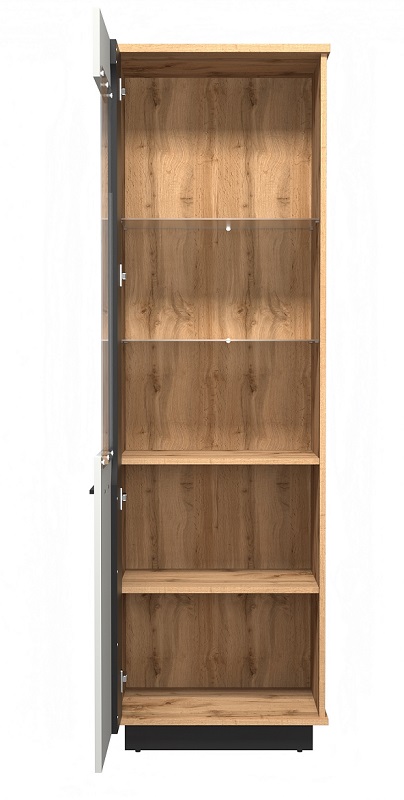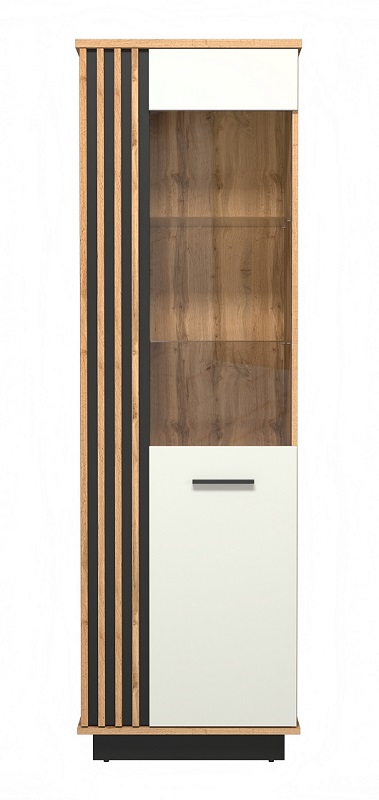 Charakterystycznym elementem witryny są pionowe lamele z płyty MDF w kolorze dębu wotan umieszczone na frontach, nadając meblowi wyjątkowego charakteru i unikatowego wyglądu. Jednodrzwiowa konstrukcja z uchwytami z tworzywa sztucznego zapewnia łatwe otwieranie i zamykanie drzwiczek, co sprawia, że korzystanie z mebla jest wygodne i komfortowe.