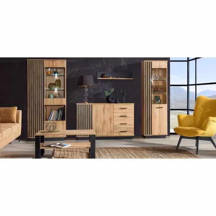 Korpus systemu wykonany jest w kolorze dąb wotan, natomiast fronty to połączenie dąb wotan z czarnym matem, które doskonale ze sobą współgrają. Lamele zastosowane na frontach wykonano z płyty MDF.