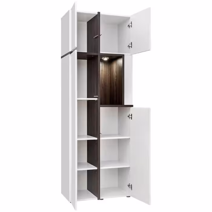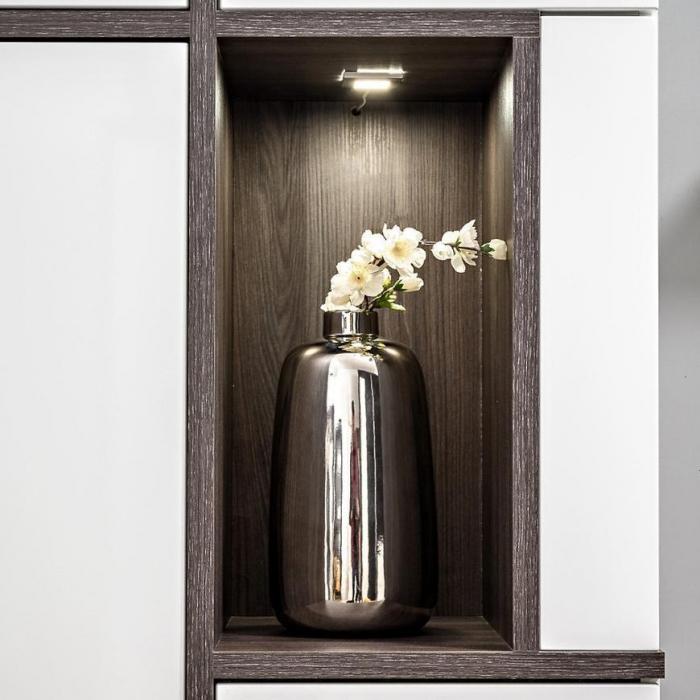 Nieodłącznym elementem kolekcji są witryny wysokie z oświetleniem LED, które idealnie nadają się do prezentacji porcelany, szkła lub dekoracji. Dzięki przeszklonym frontom i dyskretnemu podświetleniu wnętrze witryny zyskuje elegancki wygląd, a cała aranżacja staje się bardziej wyrazista. To doskonałe rozwiązanie dla osób, które cenią estetykę i porządek.