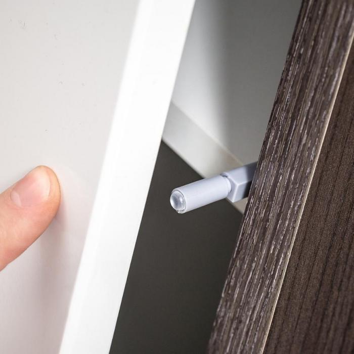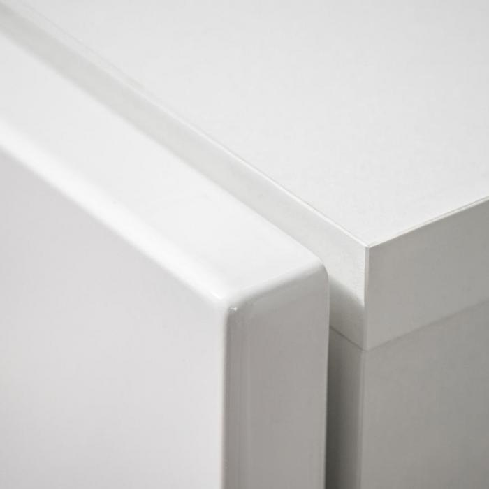 Każdy element kolekcji Cross został zaprojektowany tak, aby nie tylko cieszył oko, ale również zapewniał wygodę użytkowania na co dzień. Wysokiej jakości płyta MDF zastosowana w konstrukcji frontów gwarantuje trwałość i odporność na uszkodzenia, natomiast laminowana płyta wiórowa w korpusie wyróżnia się solidnością i łatwością w utrzymaniu czystości. Zastosowanie kontrastu pomiędzy białym połyskiem frontów a matowym wykończeniem korpusu nadaje meblom wyjątkowego charakteru i głębi.