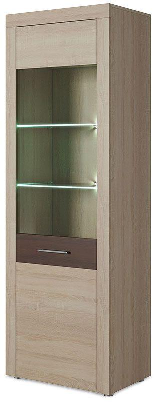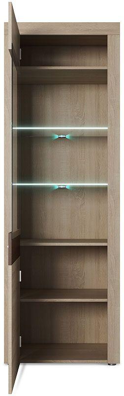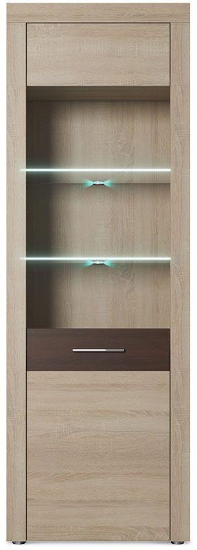 Witryna wysoka Duo 6 idealnie wkomponuje się w każde, nawet najmniejsze wnętrze! Jej dokładnie przemyślana konstrukcja (zaledwie 65 cm wysokości oraz 192 cm wysokości) sprawia, że nie zajmuje wiele przestrzeni, ale jest jednocześnie bardzo pojemna – zawiera bowiem aż sześć półek o różnej kubaturze. Dodatkowo, dwie z nich są przeszklone i oświetlone (energooszczędne oświetlenie LED płatne dodatkowo), co pozwala w prosty sposób wyeksponować dekoracyjne drobiazgi. Witryna wysoka Duo 6 wykonana została z płyt laminowanych o grubości 16 mm, utrzymanych w dwóch współgrających ze sobą kolorach – dębu sonoma oraz dębu sonoma czekoladowego. Sprawdzi się jako witryna do salonu w stylu klasycznym lub witryna do jadalni w stylu nowoczesnym.