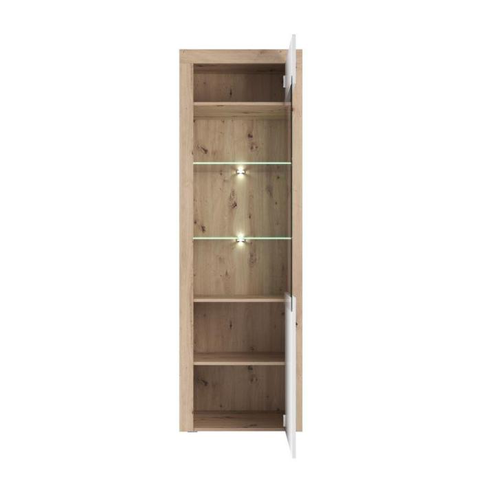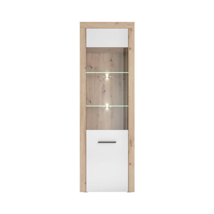 System Elso wykonany z płyty laminowanej w wybarwieniu dąb artisan z frontami w kolorze białym w połysku. Uchwyty wykonane z tworzywa w kolorze czarnym. W skład systemu wchodzą następujące bryły, komoda 2 drzwiowa 4 szuflady, szafka RTV, witryna wysoka, witryna niska, szafa dwudrzwiowa, półka, komoda 4 szuflady, szafa trzydrzwiowa z dwoma szufladami.
