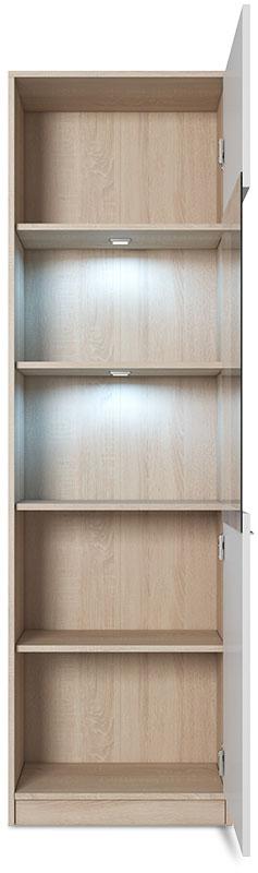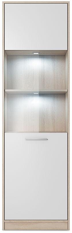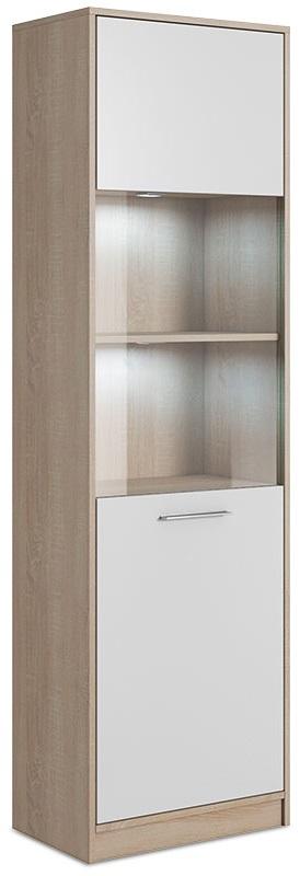 Witryny to meble wyjątkowo funkcjonalne, ale i dekoracyjne – pozwalają wygodnie przechowywać wszystkie niezbędne w domu przedmioty oraz eksponować ozdobne drobiazgi. Cechami tymi charakteryzuje się również witryna wysoka Enter 1A. Składa się ona z pięciu półek – trzy z nich znajdują się za tradycyjnym frontem, dwie zaś są przeszklone. Półki za szkłem mogą również zostać wyposażone w dodatkowo płatne nowoczesne oświetlenie LED. Witryna wysoka Enter 1A wyróżnia się też ciekawym połączeniem kolorystycznym. Korpus wykonany jest z płyty laminowanej o grubości 16 mm w kolorze dębu sonoma, zaś front – z białej, błyszczącej płyty. Oprócz walorów dekoracyjnych, witryna wysoka Enter 1A cechuje się także wysoką funkcjonalnością – ma kompaktowe wymiary (55,5x33x184 cm), jest pojemna oraz bardzo wytrzymała.