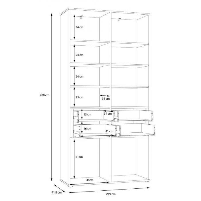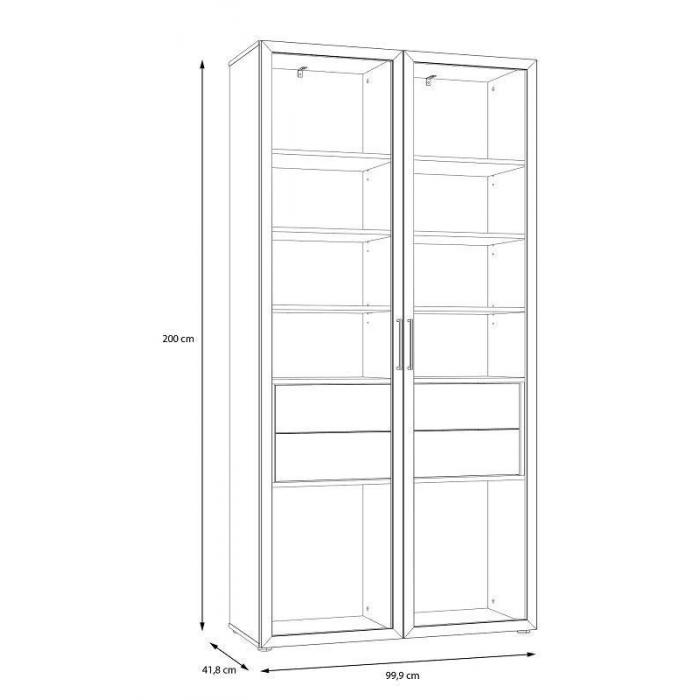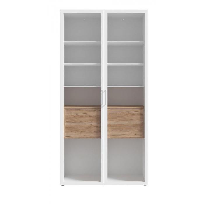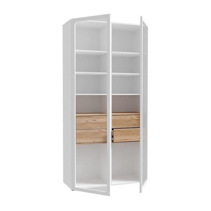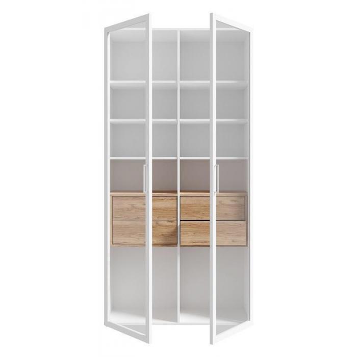 Witryna wykonana w białym wybarwieniu w połączeniu z dekorem dąb catania. Na frontach i blatach zastosowano dekor biały połysk. Uchwyty metalowe chromowane o długości 16,8 cm. Witryna posiada cztery szuflady oraz sześć półek. Maksymalne obciążenie szuflad wynosi 3 kg a półek 5 kg. W szklanych drzwiach zastosowano bezpieczne szkło hartowane. Całość witryny wsparta jest na nóżkach typu "ślizgacz" w kolorze szary mat. Wymagany montaż do ściany komplet okuć w zestawie.