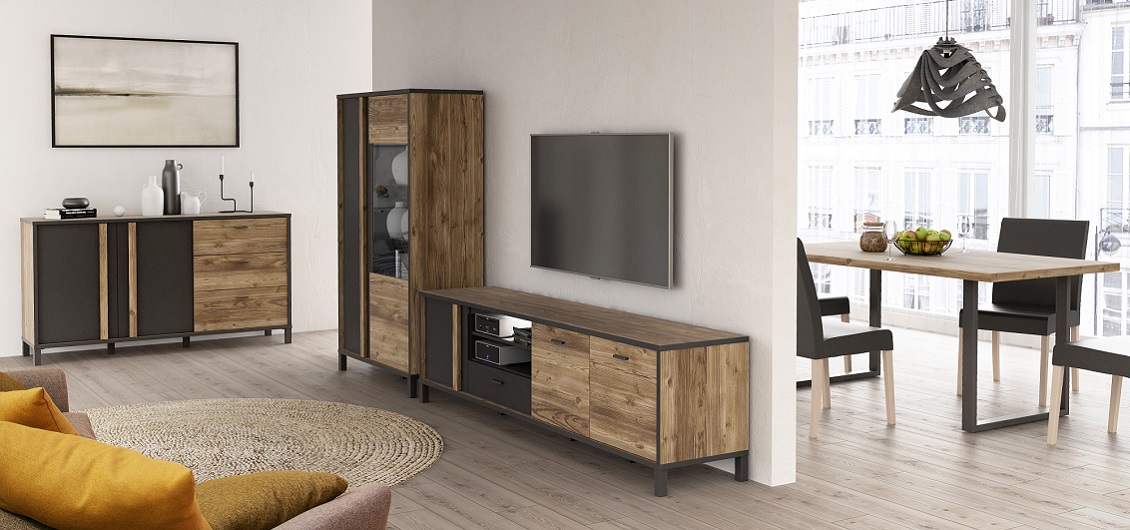 Dwie szafki RTV zapewnią odpowiednią ilość miejsca do przechowywania sprzętu elektronicznego, a szafa oraz dwie witryny stanowią idealne miejsce do przechowywania ubrań, naczyń czy innych akcesoriów.