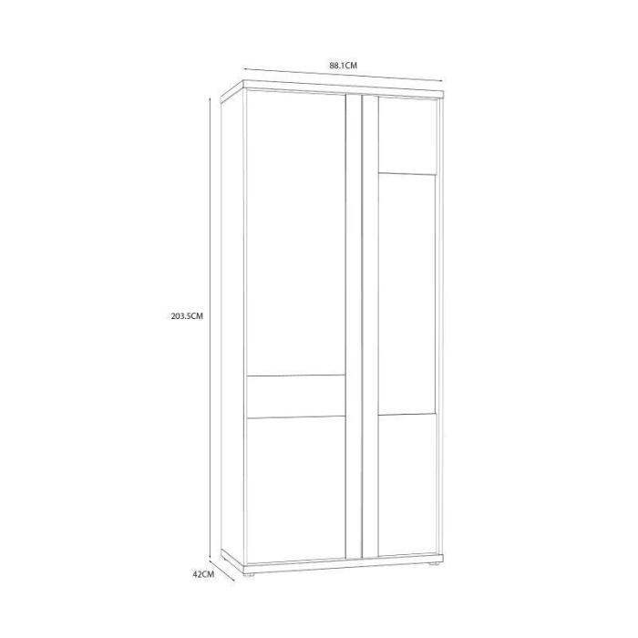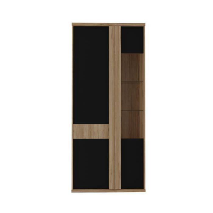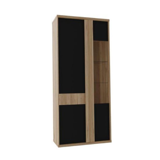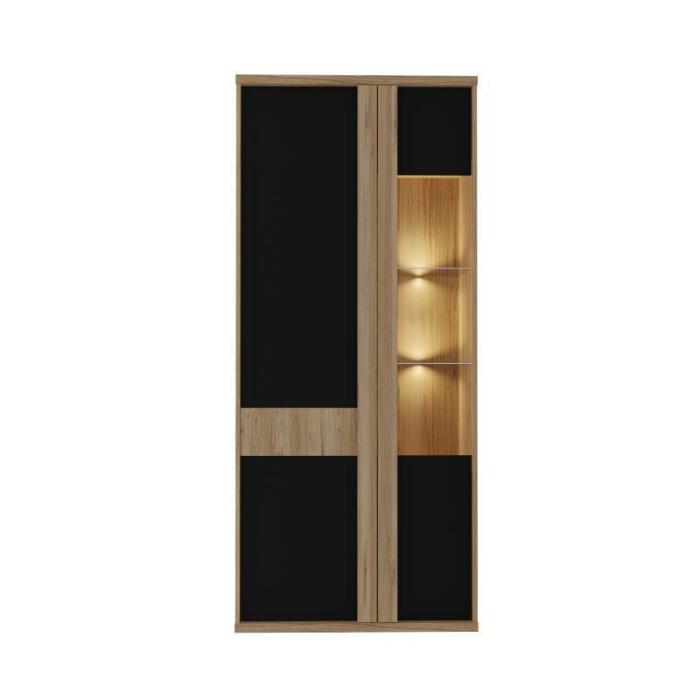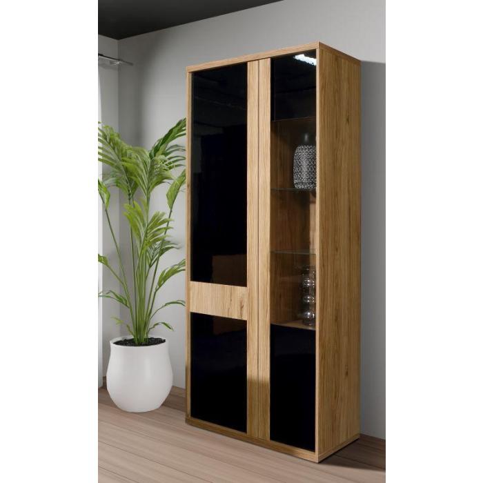Witryna wysoka Islanti, dwudrzwiowa, wykonana w wybarwieniu dąb catania z frontami w czarnym połysku. Bryły można ustawić w pokoju dziennym oraz jadalni urządzonej w nowoczesnym stylu. Przez błyszczące fronty można łączyć zabudowę z efektownymi dodatkami w stylu glamour. Na uwagę zasługują pionowe listwy służące za uchwyty, pogrubiany blat i solidna konstrukcja. Jednak to wyposażenie sprawia, że jest to mebel premium. Doskonały styl podkreśla efektowne oświetlenie (opcja dodatkowo płatna), natomiast mechanizm "push to open" ułatwia dostęp do zawartości szuflad.