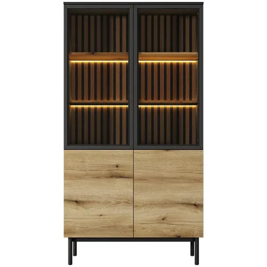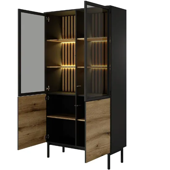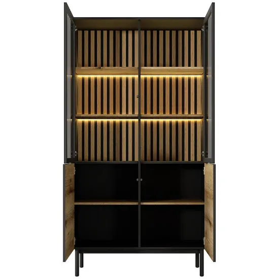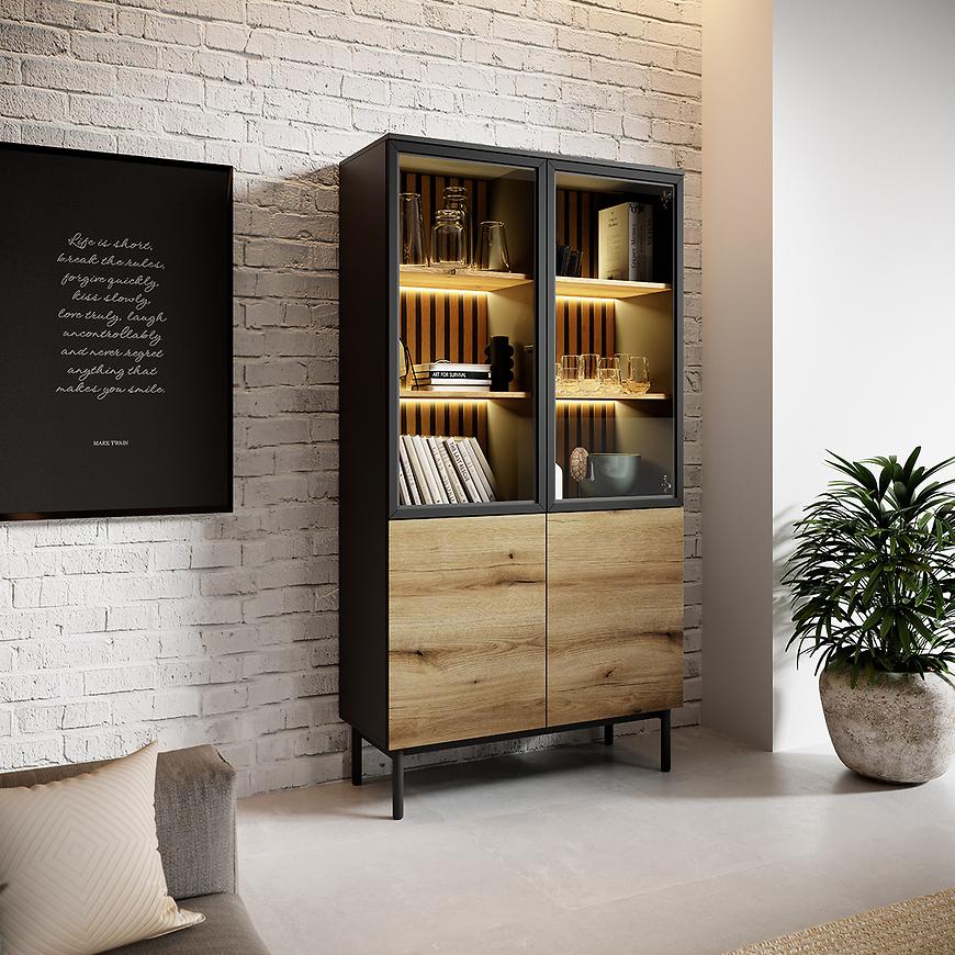 Witryna wysoka Lang A+LED czarny/dąb Evoke to nowoczesny mebel, który łączy elegancję z praktycznym oświetleniem LED. Jej sześć półek i dwudrzwiowy front pozwalają na wygodne przechowywanie i ekspozycję przedmiotów, a laminowana konstrukcja i matowe wykończenie zapewniają trwałość i estetyczny wygląd. Wysoki i pojemny model idealnie wkomponuje się w salon, jadalnię lub inne przestrzenie użytkowe, wnosząc nowoczesny i stylowy akcent do wnętrza.