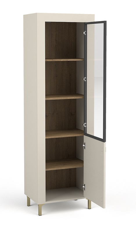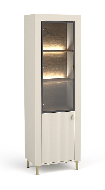 Witryna Mossa MO3 jest jednodrzwiowa, co czyni ją eleganckim i kompaktowym rozwiązaniem, które świetnie wpisuje się w różne aranżacje. Korpus oraz fronty mebla wykonane są z płyty meblowej w kolorze cashmere, który dodaje wnętrzu ciepłego i subtelnego charakteru. Kolor cashmere jest elegancki i uniwersalny, doskonale komponując się z innymi odcieniami i stylami dekoracyjnymi. Fronty są dodatkowo wzbogacone o efekt prążkowania, który nadaje im nowoczesnego wyglądu i unikalnej tekstury. Prążki wprowadzają ciekawy detal, który przełamuje gładką powierzchnię, tworząc interesujący wizualnie akcent.