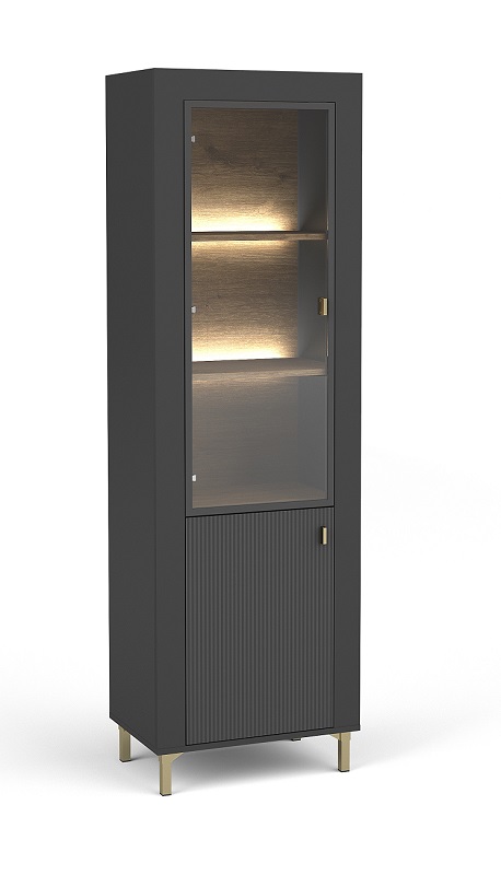 Korpus witryny wykonany jest z wysokiej jakości płyty meblowej w kolorze czarny mat. Ten elegancki odcień wprowadza do wnętrza nowoczesny, minimalistyczny akcent. Matowe wykończenie korpusu jest nie tylko estetyczne, ale także praktyczne, ponieważ nie widać na nim odcisków palców ani drobnych zarysowań, co ułatwia utrzymanie mebla w czystości. Fronty witryny, również w kolorze czarny mat, wzbogacono o efekt prążkowania, który dodaje im tekstury i nowoczesnego charakteru. Subtelne prążki wprowadzają interesujący detal, który przełamuje jednolitą powierzchnię, nadając witrynie oryginalny wygląd.