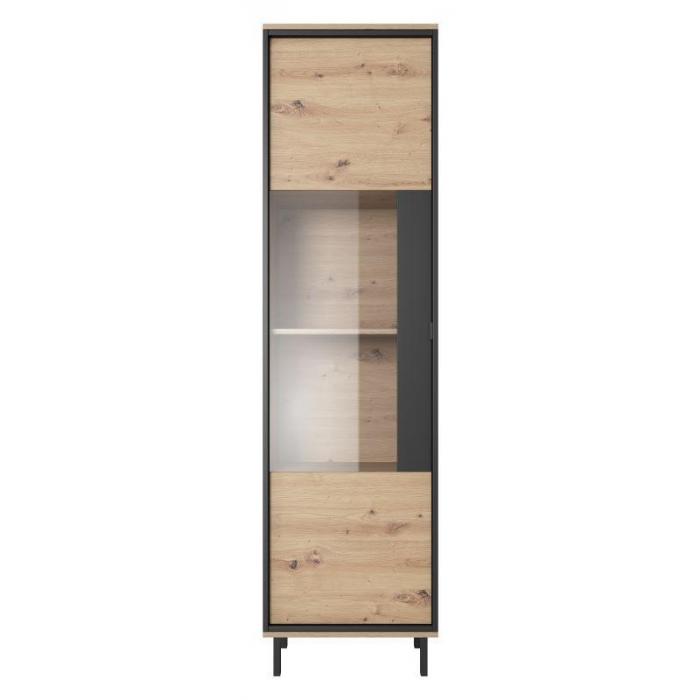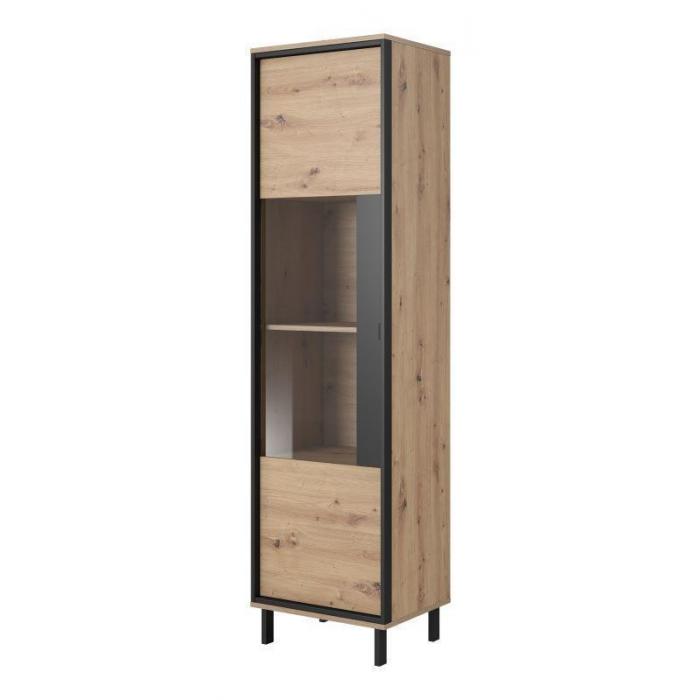 Korpus i fronty witryny wykonane w wybarwieniu dąb artisan z czarnymi wstawkami we frontach. Drzwi z przeszkleniem za którymi znajdują się dodatkowe półki do przechowywania. Nóżki i uchwyty witryny Nest zostały wykonane z metalu w kolorze czarnym. Bryły wykończone listwą MDF w kolorze antracyt (czarny). Do witryny można domówić za dodatkową opłatą oświetlenie LED.