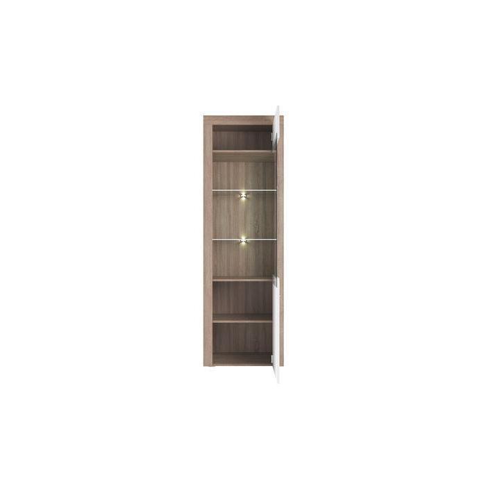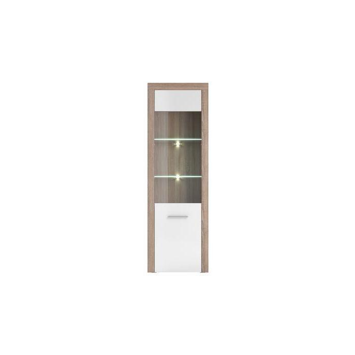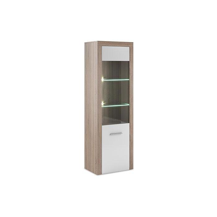 Witryna do salonu to doskonałe rozwiązane dla każdego, kto chce w wygodny sposób przechowywać wszystkie niezbędne przedmioty, a jednocześnie wyeksponować dekoracje. Witryna wysoka One 6 łączy oba te aspekty – posiada bowiem trzy zamykane szafki, a także trzy półki przeszklone, które zyskują jeszcze więcej uroku, gdy zostają uzupełnione o dodatkowe oświetlenie LED. Została wykonana z płyt laminowanych o grubości 16 mm, które zapewniają jej solidność i wytrzymałość, a także elementów szklanych i z tworzyw sztucznych. Wyróżnikiem witryny wysokiej One 6 jest ponadto ciekawe połączenie kolorystyczne: korpus mebla utrzymany jest w naturalnym odcieniu dębu sonoma, a część frontów zachwyca śnieżną bielą. Dzięki temu idealnie pasuje do wnętrz klasycznych i nowoczesnych.