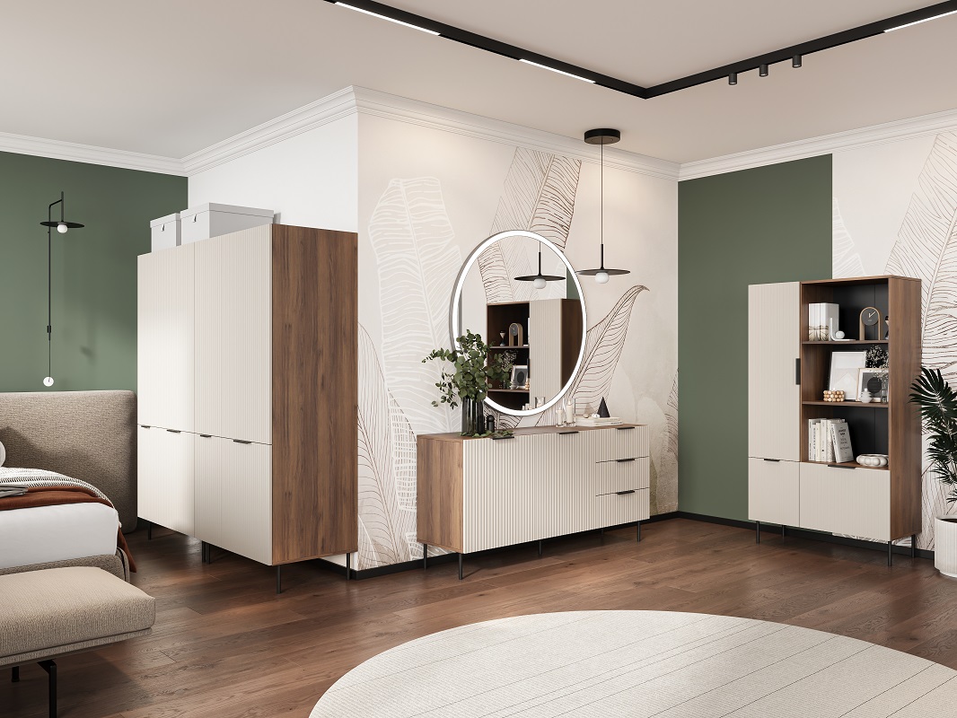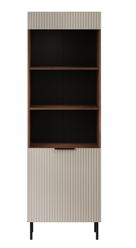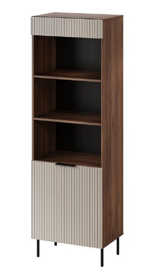 Witryna Almera wyróżnia się nowoczesnym designem, który harmonijnie łączy klasyczny styl z nowoczesnymi akcentami. Korpus w eleganckim wybarwieniu orzech warmia nadaje całości ciepłego i naturalnego charakteru, który doskonale komponuje się z różnymi aranżacjami wnętrz. Frezowane fronty w modnym odcieniu kaszmir lamelka wprowadzają nowoczesny akcent, nadając witrynie lekkości i finezji. Ten mebel świetnie sprawdzi się zarówno w klasycznych, jak i bardziej współczesnych wnętrzach.