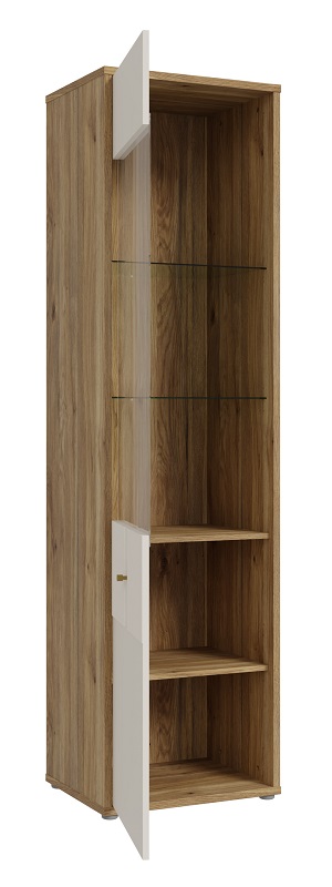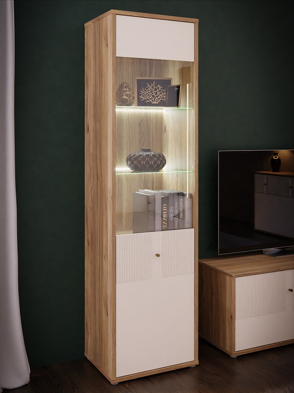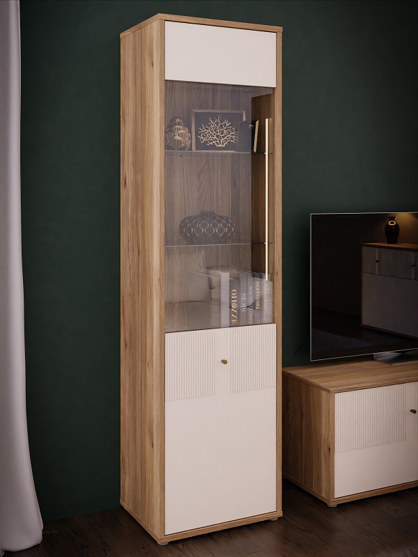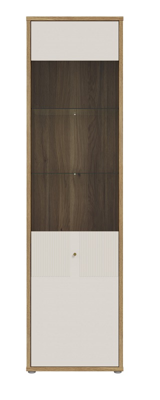 Fronty witryny zostały wzbogacone o subtelne elementy dekoru piaskowego oraz ryflowany MDF, który dodaje całości wyjątkowego charakteru i elegancji. Ryflowane wykończenie frontów podkreśla nowoczesny design mebla, a także wprowadza element dynamiki i głębi. Witryna jest jednodrzwiowa, z drzwiami uchylnymi, które w połowie są przeszklone. Takie rozwiązanie pozwala na efektowne eksponowanie ozdobnych przedmiotów, książek czy zastawy stołowej, jednocześnie chroniąc je przed kurzem.