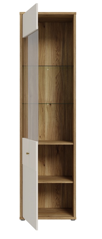 Wewnątrz witryny znajdują się trzy półki, które oferują sporo miejsca do przechowywania. Układ półek jest przemyślany w taki sposób, aby maksymalnie wykorzystać przestrzeń i umożliwić wygodne przechowywanie różnorodnych przedmiotów. Metalowe uchwyty w kolorze złotym stanowią elegancki akcent, który dodaje meblowi luksusowego wyrazu i podkreśla jego nowoczesny styl.