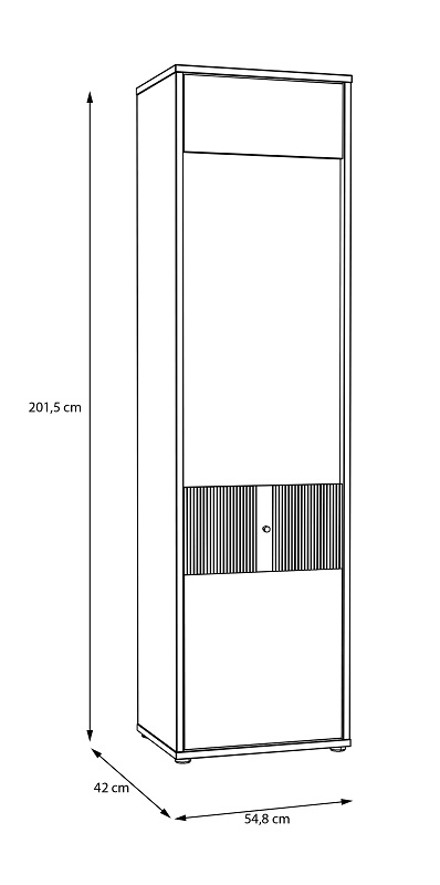 Fronty witryny zostały wzbogacone o subtelne elementy dekoru piaskowego oraz ryflowany MDF, który dodaje całości wyjątkowego charakteru i elegancji. Ryflowane wykończenie frontów podkreśla nowoczesny design mebla, a także wprowadza element dynamiki i głębi. Witryna jest jednodrzwiowa, z drzwiami uchylnymi, które w połowie są przeszklone. Takie rozwiązanie pozwala na efektowne eksponowanie ozdobnych przedmiotów, książek czy zastawy stołowej, jednocześnie chroniąc je przed kurzem.