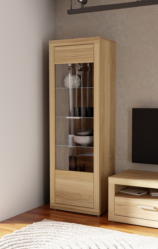 Model Sand został wyposażony w jedne uchylne drzwi, pod którymi znajdują się cztery przestronne półki. Taka konstrukcja umożliwia wygodne przechowywanie zastawy stołowej, dekoracji, książek oraz innych przedmiotów codziennego użytku. Uchylne drzwi w połączeniu z matowym wykończeniem podkreślają nowoczesny i minimalistyczny charakter witryny, a kompaktowe wymiary sprawiają, że mebel doskonale sprawdzi się w salonie, jadalni czy pokoju dziennym.