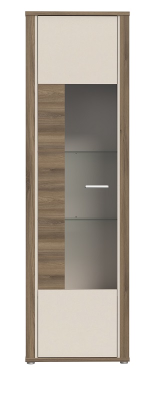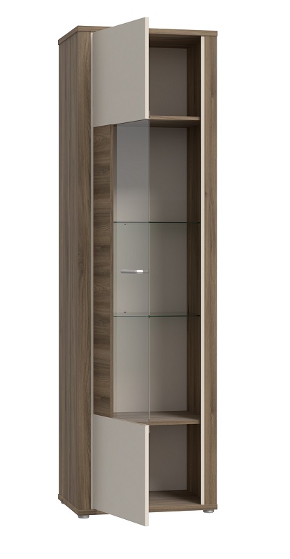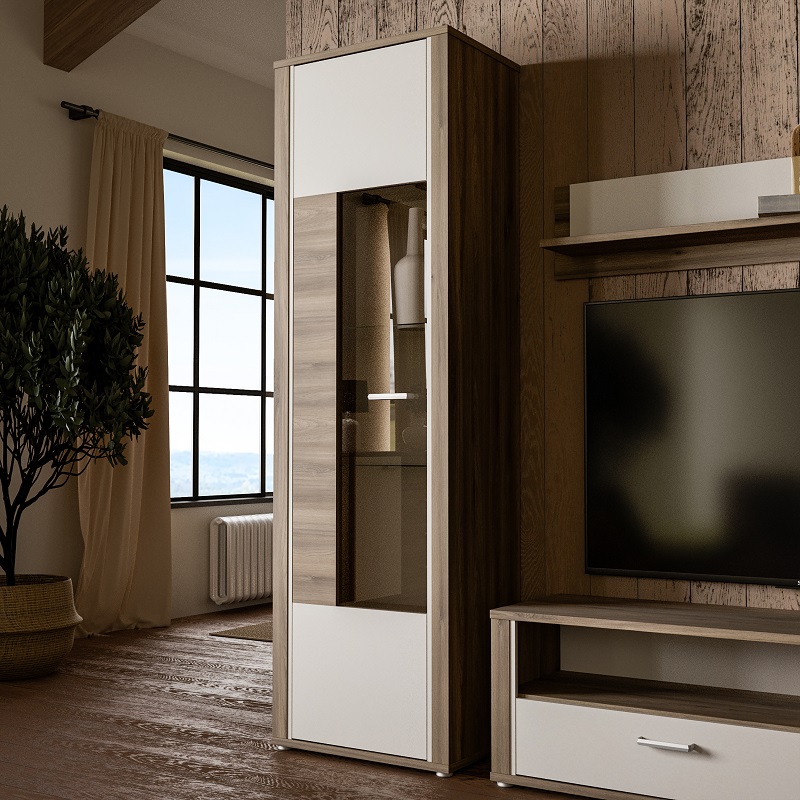 Witryna jednodrzwiowa Savios DDLV712 to doskonałe rozwiązanie do Twojego pokoju dziennego lub jadalni, łączące funkcjonalność z elegancją. Wykonana z wysokiej jakości płyty meblowej w ciepłym odcieniu dębu valencia, ta witryna dodaje wnętrzu naturalnego uroku i przytulnego charakteru.