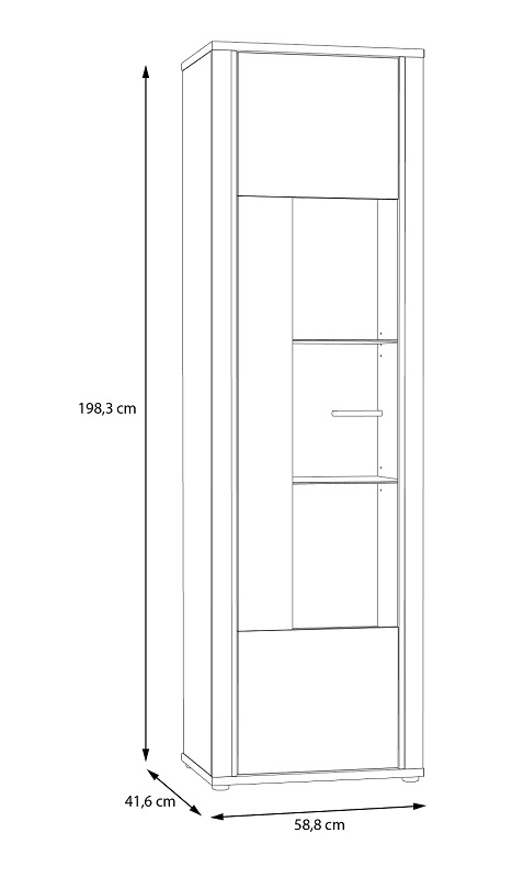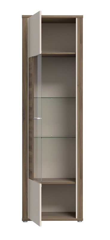 Drzwi witryny są przeszklone, co dodaje jej lekkości i elegancji, a jednocześnie umożliwia wyeksponowanie ulubionych przedmiotów czy dekoracji. Wnętrze witryny wyposażone jest w cztery półki, w tym dwie półki szklane, które dodatkowo podkreślają jej styl i sprawiają, że przechowywane przedmioty prezentują się jeszcze lepiej.