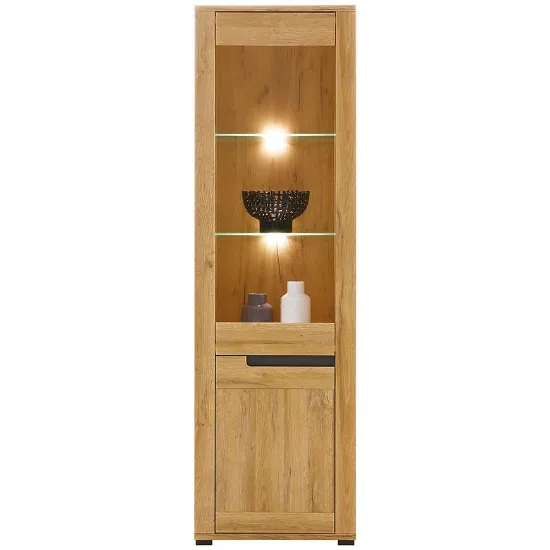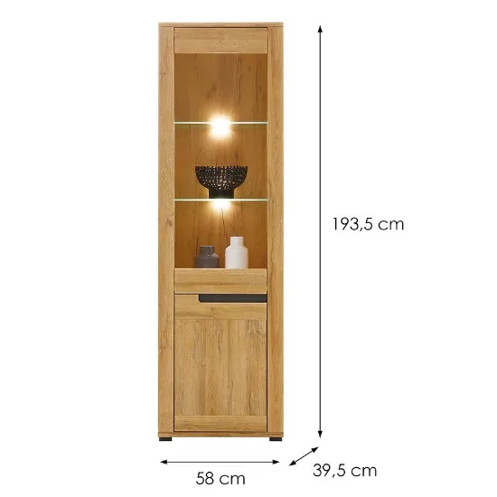 Witryna York to doskonałe połączenie estetyki i praktyczności, idealne do nowoczesnych wnętrz. Wykonana z trwałej płyty wiórowej laminowanej, cechuje się wysoką odpornością na uszkodzenia i łatwością w pielęgnacji. Jej fronty w matowym wykończeniu oraz ciepły odcień dębu grandson nadają wnętrzu przytulny i elegancki charakter.