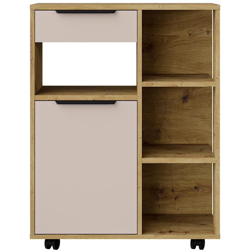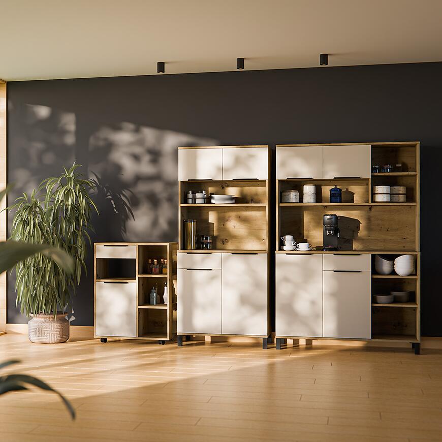 Wózek Linda Cashmere 80 (SOLEA) łączy nowoczesny design z funkcjonalnością. Fronty w jasnym odcieniu cashmere w połączeniu z korpusem w kolorze dąb artisan nadają meblowi elegancki i przytulny charakter. Matowe wykończenie podkreśla nowoczesny styl, dzięki czemu wózek doskonale komponuje się z aranżacjami w stylu skandynawskim, minimalistycznym lub loftowym.