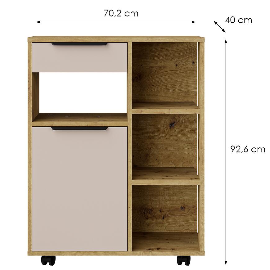 Kredens posiada dwie półki i jedną szufladę, a jednodrzwiowa konstrukcja umożliwia wygodne przechowywanie naczyń, dokumentów czy dekoracji. Wymiary mebla – szerokość 70,2 cm, wysokość 92,6 cm i głębokość 40 cm – zapewniają kompaktowe proporcje, dzięki czemu wózek zmieści się w różnych pomieszczeniach, oferując jednocześnie praktyczną przestrzeń do przechowywania.
