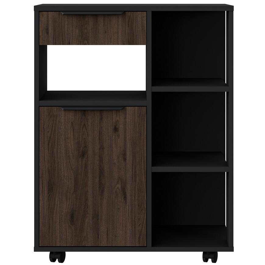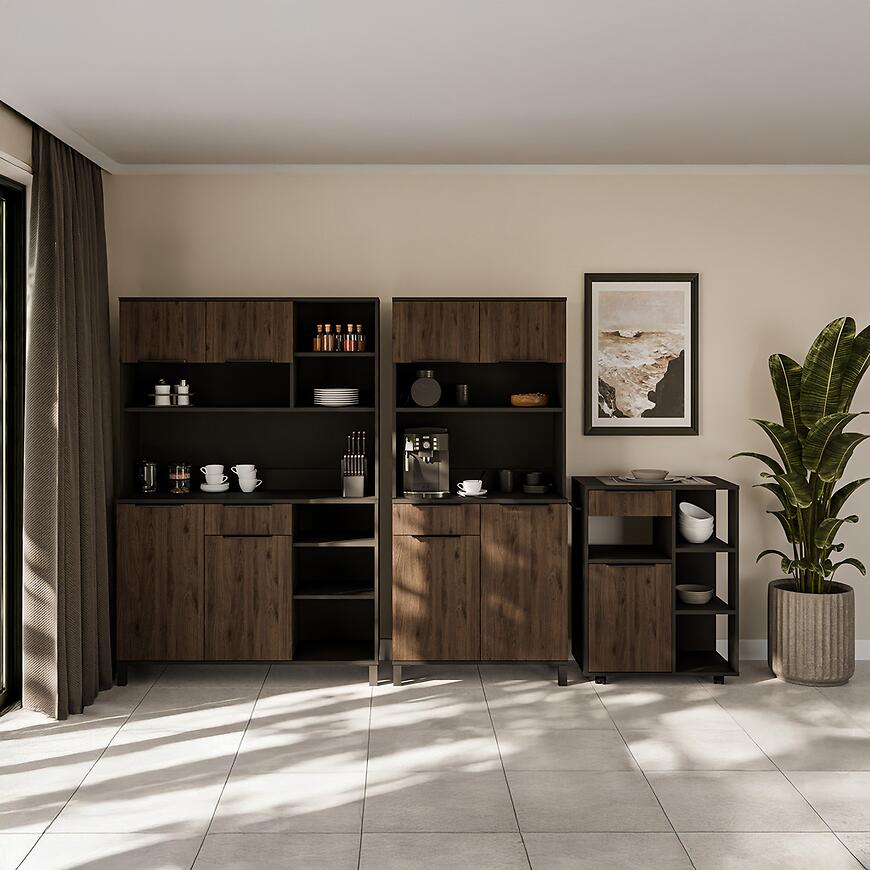 Wózek Linda Orzech Okapi 80 (MONZA) łączy elegancki wygląd z funkcjonalnością. Ciemne, drewnopodobne fronty w połączeniu z czarnym, matowym korpusem nadają meblowi nowoczesny charakter. Model doskonale wpisuje się w aranżacje salonów, jadalni oraz przestrzeni loftowych i minimalistycznych, wprowadzając stylowy akcent do wnętrza.