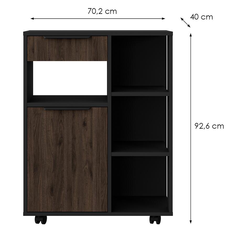 Kredens wyposażono w dwie półki i jedną szufladę, a jednodrzwiowa konstrukcja pozwala na wygodne przechowywanie naczyń, dokumentów czy dekoracji. Wymiary mebla – szerokość 70,2 cm, wysokość 92,6 cm i głębokość 40 cm – zapewniają kompaktowe proporcje, dzięki czemu wózek można ustawić w różnych miejscach w pomieszczeniu, zachowując funkcjonalność i porządek.