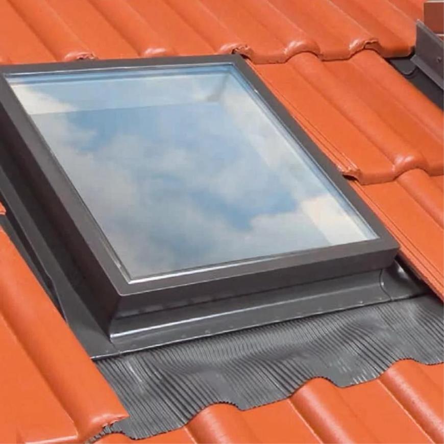 Dodatkowym atutem jest uniwersalny aluminiowy kołnierz uszczelniający zakończony elastycznym fartuchem. Takie rozwiązanie pozwala na dopasowanie wyłazu do większości pokryć dachowych i gwarantuje wysoką szczelność.